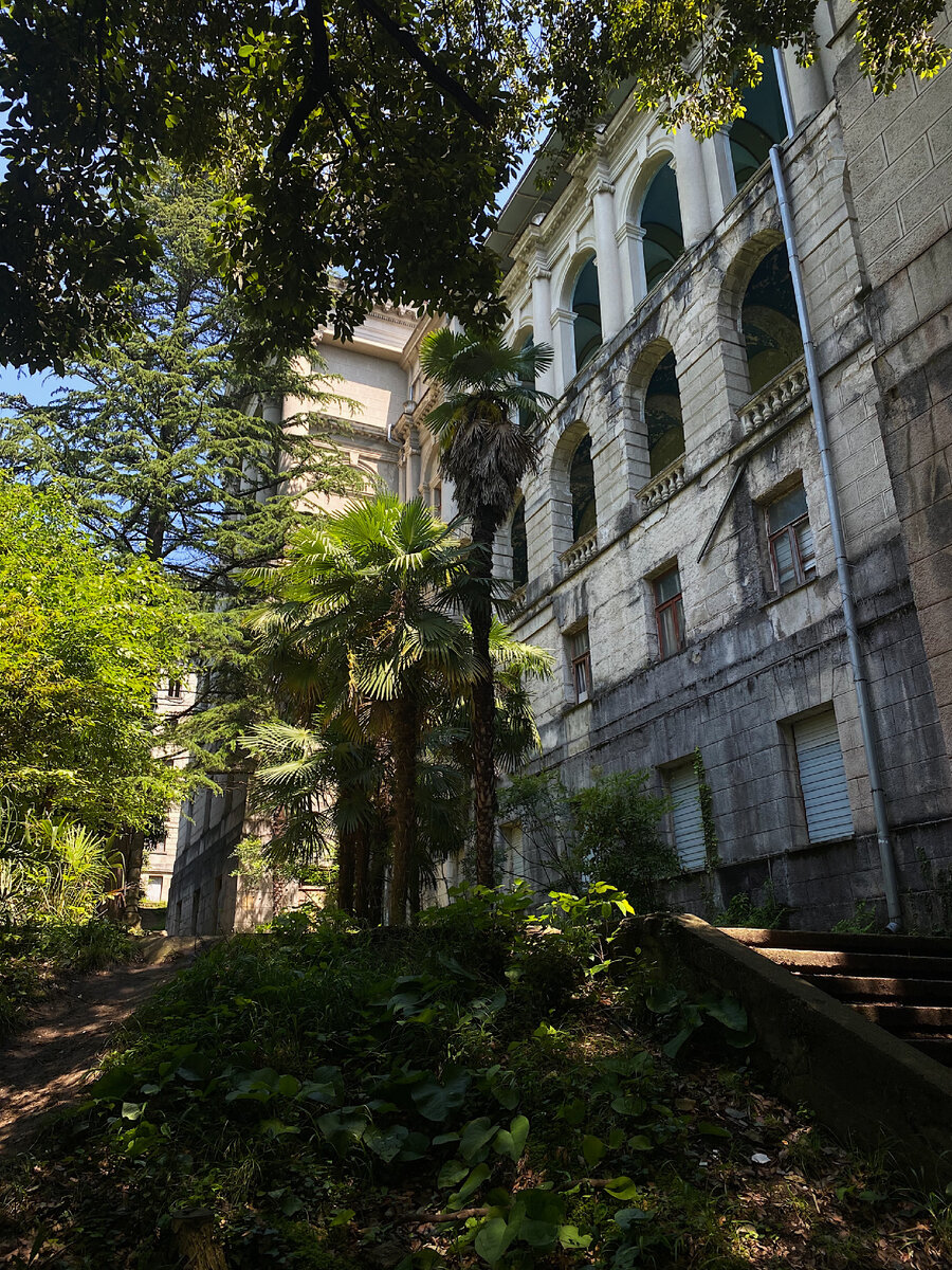Я всем сердцем люблю российский юг, даже несмотря на спорные моменты и некоторые минусы, многим известные. В очередной раз мы приехали в Сочи и решили посетить одно очень интересное место, которые вызывает довольно неоднозначные эмоции и впечатления - это санаторий имени С. Орджоникидзе. Большинству он известен по фильму «Старик Хоттабыч». Огромный, помпезный комплекс в стиле неоклассицизма был построен в 1937 году и предназначался для отдыха советских граждан (что сейчас кажется немыслимым))! Но, к огромному сожалению, в 2010 году санаторий был закрыт на реконструкцию, которая ведется по сей день. Попасть на территорию заброшенного санатория несложно. Проще всего доехать на такси или на машине. Ворота заколочены, поэтому придется лезть буквально через дырку в заборе. Звучит немного дико, но другого входа вроде как нет. Немного пройдя через джунгли вы попадаете на территорию «чудесного дворца могущественного владыки» (именно так назывался санаторий в фильме о Хоттабыче). Людей на