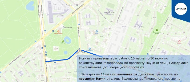 Проезд по проспекту Науки ограничат до середины мая Новые ограничения движения вступят в силу в Петербурге с 16 марта. В центре водителей потеснят до конца апреля, в Калининском районе — до середины мая. На участке проспекта Науки от улицы Академика Константинова до Тихорецкого проспекта до 30 июня будут реконструировать газопровод. В связи с этим с 16 марта по 14 мая ограничат движение по проспекту от улицы Веденеева до Тихорецкого проспекта, сообщает 14 марта пресс-служба государственной административно-технической инспекции Петербурга. До 27 апреля в связи с размещением пешеходной галереи у дома 2, литера А, по Мошкову переулку ограничат проезд по Мошкову переулку от Дворцовой набережной до Миллионной улицы. Объехать участок можно будет по Дворцовой набережной, Мраморному переулку и Миллионной улице.