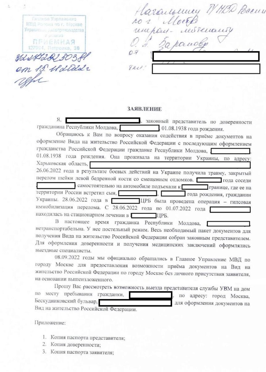 Получение Вида на жительство гр. Республики Молдова, которая в результате боевых действий в зоне СВО стала нетранспортабельной
