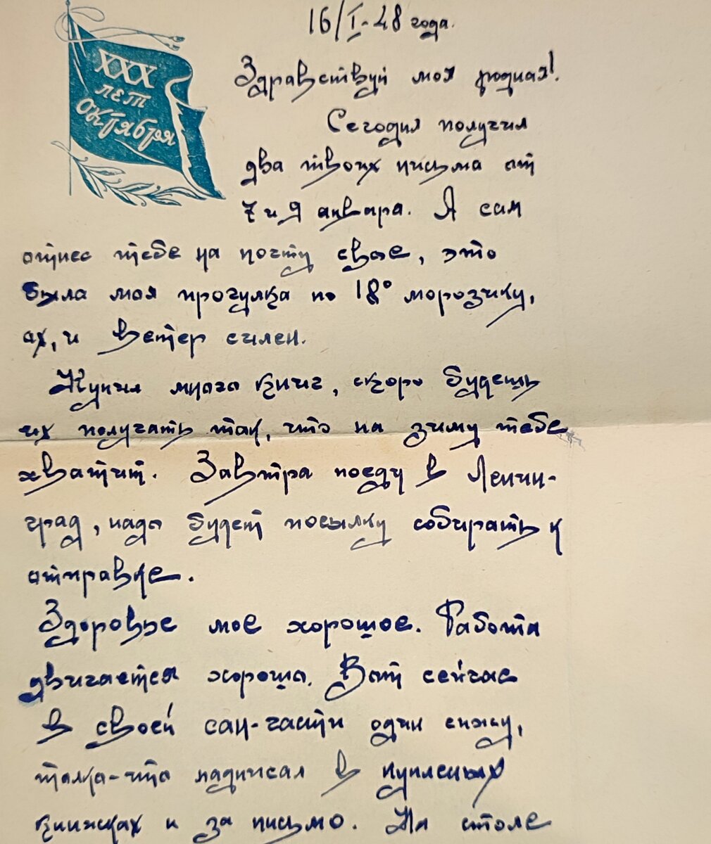 Ораниенбаум Письма, которые дедушка писал своей маме. 15 января 1948 года Здравствуй, моя родная! Опять три дня нет твоих писем, решил сегодня написать, да и надо торопиться, а то света нет. Вот и спать ложимся рано. Вчера был в Ленинграде. С Евдокией Михайловной ходили в театр. Слушали Чайковского "Чародейку", мне вот только музыка плоховатая показалась, если сравнить с другими его произведениями. Ведь это была моя первая вылазка в Ленинградский театр. А какой театр, бывший императорский, "Оперы и балета имени Кирова". Места были хорошие. Напишу письмо и на почту схожу, его надо отнести и тебе 200 руб отправить, а то сильно задержал. В эту получку надо будет купить хорошие туфли и галоши. Эти деньги очень скользкие, просто в руках не держится. Погодка стоит тёплая, хожу в фуражке. Здоровье моё хорошее. Как у тебя успехи? Всем нашим привет. Будь здорова. Целую, твой Лёва. 16 января 1948 года Здравствуй, моя родная! Сегодня получил два твоих письма от 7 и 9 января. А сам отнёс тебе на