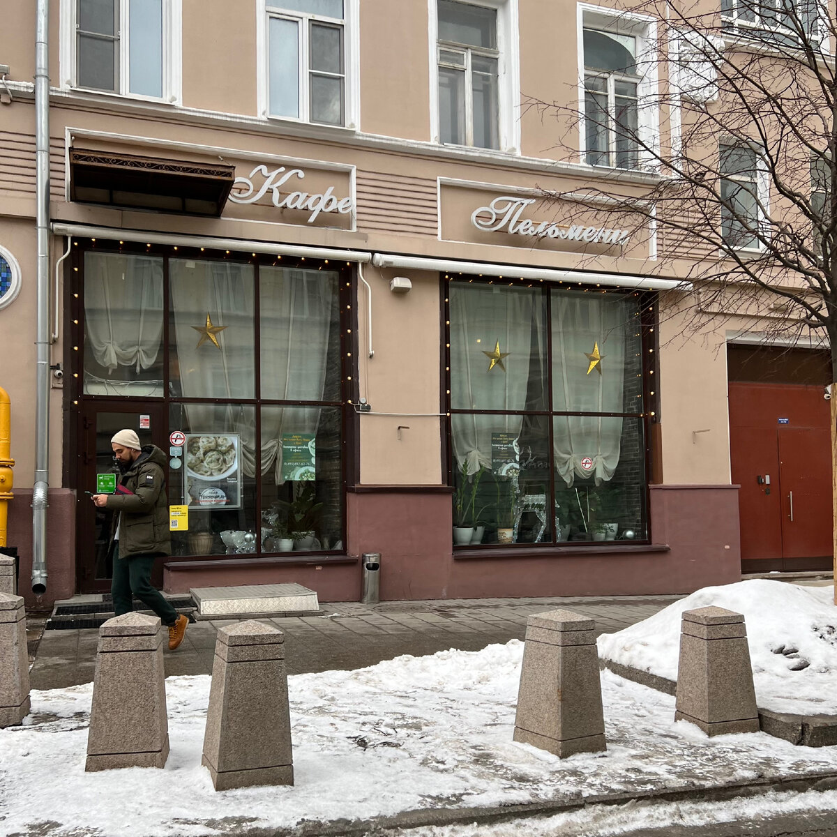 Кафе «Пельмени» на улице Ленивке, в самом центре Москвы. Рядом Государственный музей изобразительных искусств им. А. С. Пушкина и храм Христа Спасителя. Раньше, в советское время, на том же месте работала обычная городская «Пельменная». Постсоветское кафе сидит на первом этаже жилого дореволюционного дома. Напротив хинкальная «Триумф» и «шведский стол без ограничений за 650 рублей». С одной стороны коричневая железная дверь подъезда, с другой арка и желтая труба. Фасад простой. Оформление отсылает к общепиту 90-х. Кофейный цвет, два больших коричневых окна, белая вывеска курсивом и козырек над одиночной дверью.