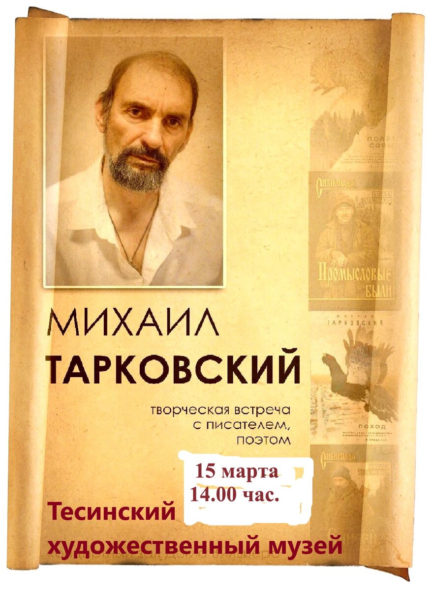 14.03.2023 Вторник Настоящим имею честь сообщить заинтересованным лицам, проживающим (или гостям) в селе Тесь Минусинского района: 15 марта в 14 часов в Тесинском художественном музее состоится встреча с российским писателем Михаилом Александровичем Тарковским, автором более полутора десятков художественных книг... С поэтом, кинематографистом... Редкое событие для сибирской глубинки – не упустите шанс приблизиться и приобщиться. Увидеть воочию и пообщаться с даровитым мастером поэзии и прозы. Посмотреть необычный фильм. Приобрести книги с автографом! Просто сфотографироваться! Не буду отсылать вас к Википедии, или на иные ресурсы. Сообщу здесь: Тарковский Михаил Александрович, русский поэт, писатель, член СП России, член Союза кинематографистов РФ. Родился в 1958 г. в Москве. Закончил Московский педагогический институт им. В.И.Ленина по специальности география/биология. В 1981 году уехал в Туруханский район Красноярского края, где почти сразу же начал писать стихи, и где работал снач