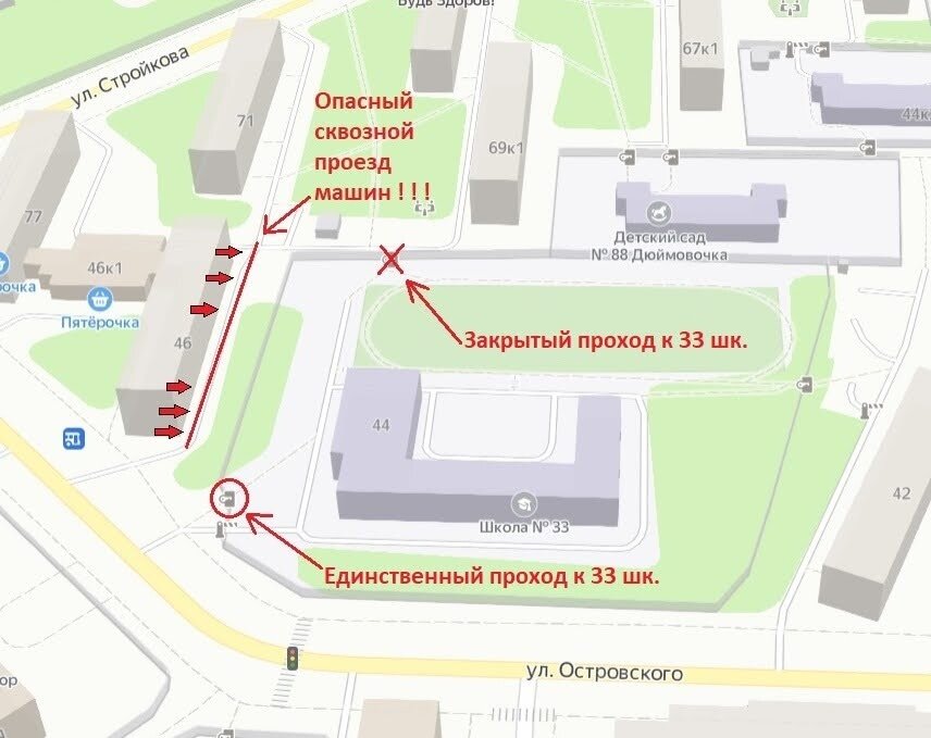 В 2022 году после закрытия сквозного прохода к 33 школе, дети стали ходить в школу вдоль забора по дворовой проезжей части и ситуация обострилась в разы!!!
