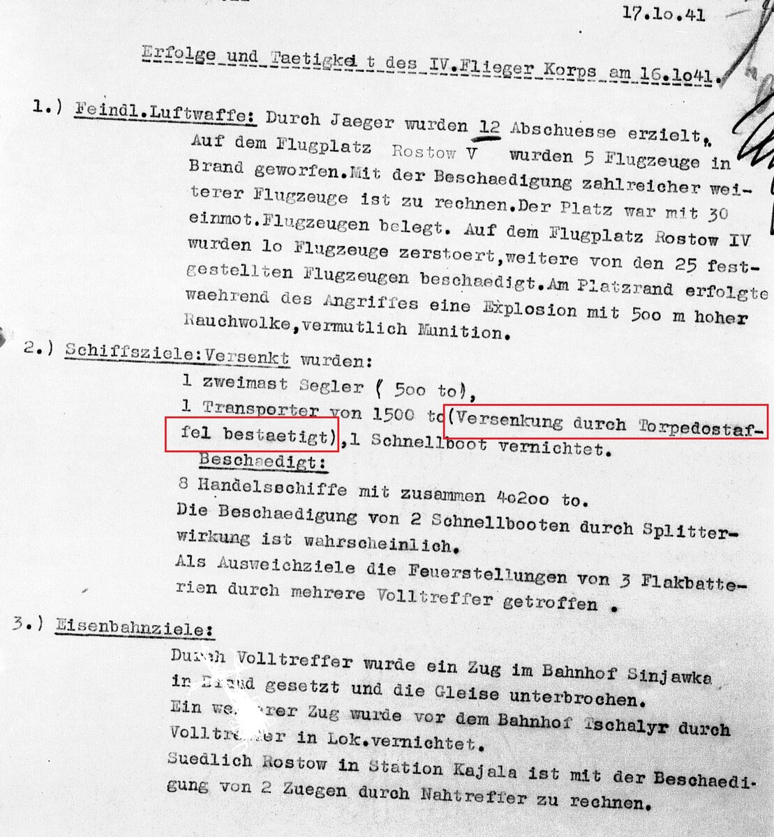 В одном из интернет-текстов нашел данные: "Через четыре дня, 20 октября два торпедоносца из 1./KG.28 атаковали в районе Феодосии танкер «Иосиф Сталин» (7.596 брт), но ему повезло: торпеды прошли мимо. Хотя один из атаковавших лётчиков – обер-лейтенант Хорст фон Люттиц – заявил о прямом попадании своей торпеды".