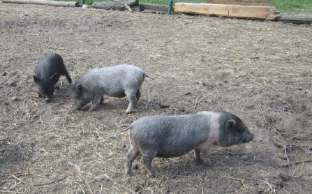 Несколько лет назад прочитала статью про Вьетнамских вислобрюхих свиней. Порода замечательная... Ест мало, растет быстро, не роет - не копает, клетки не разбивает и все в этом духе... Загорелась я желанием купить себе эту чудо-свинку... Начала готовиться заранее. Муж сделал новое стойло для поросяток, вольер для выгула, съездила в московскую область в хозяйство, где занимались выращиванием вислобрюхих свиней... И оттуда я привезла мальчишку и двух девчат....