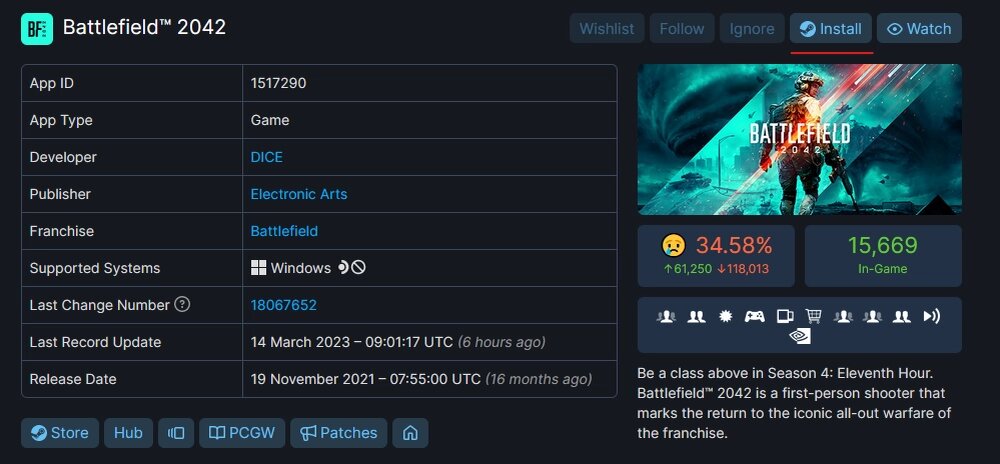 Для российских игроков страница с игрой в магазине Valve недоступна из-за приостановки деятельности EA в РФ. Но есть обходной путь для скачивания Battlefield 2042. Для этого вам потребуется перейти на страницу шутера в SteamDB и в правом верхнем углу нажать на иконку Install.
