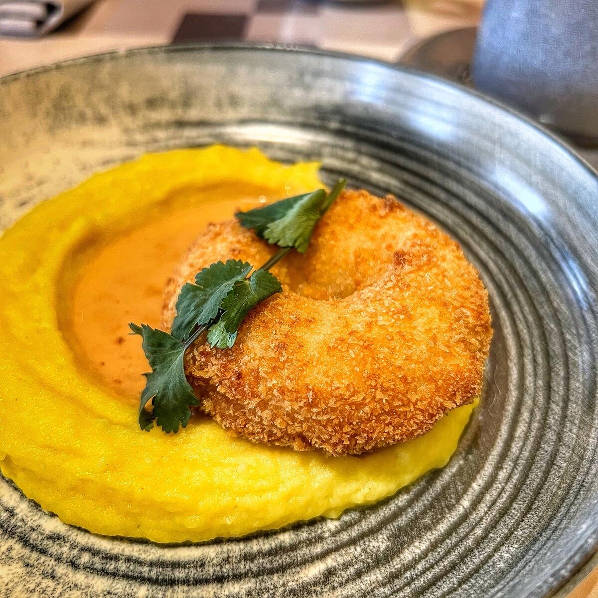 Волею случая отобедал в ресторане Twenty Two. Взял крабовый пончик на картофельном пюре из обеденного меню по 330 ₽. Уточнил у официантки, из чего сделан пончик. Говорит, из крабового мяса и креветки. Спрашиваю, прям крабовое мясо? Замялась немного, — говорит, крабовые палочки. То-то же. Внешне это выглядиn так. Картофельное пюре выложено в форме ватрушки. В центре налит соус а-ля креветочный биск. На этом лежит пончик-калачик, а уже на пончике веточка кинзы. Пончик в панировке. Панировка упругая, золотистая, хрустит. Но чуть забивает нежный вкус начинки. Картофельное пюре еле тёплое, как и соус, а пончик огненно горячий. Задумано это так или пюре просто ждало, пока приготовится пончик, не знаю. Оттого, что кинзу положили на горячий пончик, она увяла еще до подачи блюда. Уж лучше бы на картофель. Оценка 7,5 из 10. Неплохо, но толстовата панировка, странная температурная разница между пончиком и гарниром и поникшая веточка кинзы.