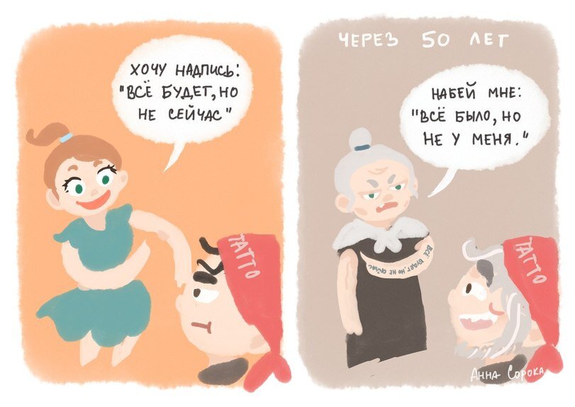 Привет, дорогой друг! Вечнее, чем батин пиджак со свадьбы и зарплата без повышений в «так-себе» компании, может быть только татуировка на теле. Хотя и от нее можно избавиться… чего не сказать о папином костюме-троечке. Люди делают тату, чтобы выделиться среди остальных. Как-будто квартиры не в ипотеку для этого недостаточно). В общем, мода на татуировки, кажется, вечна. Сегодня я собрал 7 смешных комиксов про любителей татуировок. Уверен, они вас повеселят. Даже если вы никогда не задумывались о том, чтобы набить себе что-то. Возможно, все впереди). Кстати – неплохая фраза для тату на запястье. Ловите идею, и приятного чтения! Многие люди выбирают в качестве татуировок мотивирующие цитаты. Например, девиз «Бери от жизни все» поможет не жалеть о трех тортах в продуктовой корзинке). Автор Анна Сорокина забавно пошутила в своем комиксе о подобных тату, и о том, какие смыслы они приобретают со временем. Тату всегда характеризует своего хозяина. Например, девушка с воздушным шариком на запя