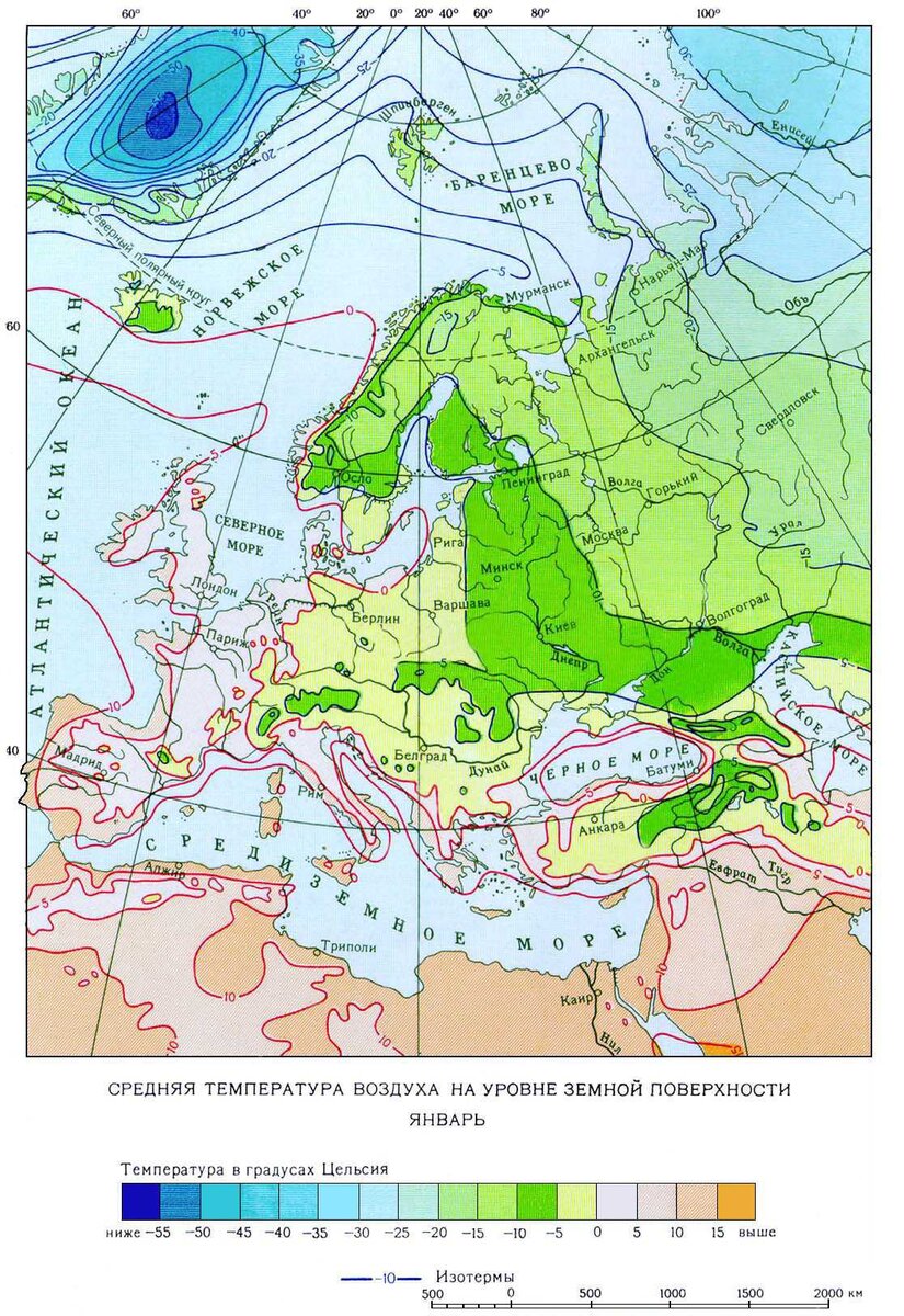 Это приводит к тому, что в Лондоне, несмотря на то, что он находится на 51,5 гр.с.ш., растут пальмы, а средняя температура в января в Стокгольме -1 градус, в Осло -2, Хельсинки -5 градусов против -6,6 в Москве. Но Москва - это далеко не вся Россия. Вот так выглядит карта изотерм средней температуры января по всей России. Как говорится почувствуйте разницу.