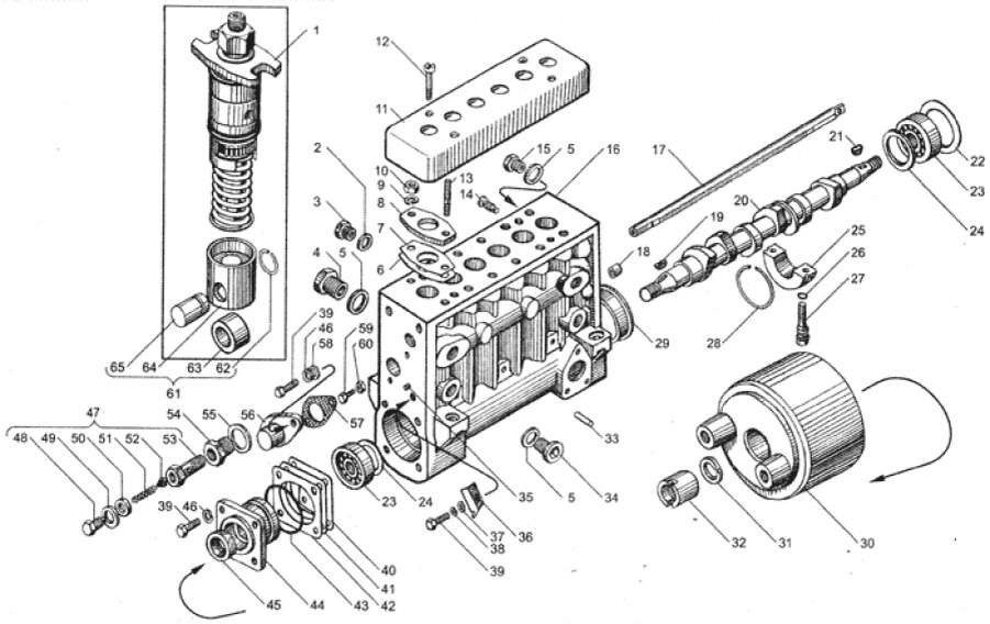 Чтобы выполнять свои функции, ТНВД имеет крайне сложное строение. Подача топлива обеспечивается за счет слаженной работы плунжерной пары, толкателей, кулачкового вала и возвратных пружин с тарелками, а так же большому количеству вспомогательных мелких деталей.