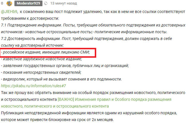 Давно пишу про экономику и каждый раз публикуя новый пост, я будто играю в сапера, потому что не пойму за что опять могут снести мой пост или опять забанить. Первый мой пост снесли за отсутствие тега "политика". Ок, экономика связана с политикой и поэтому начал указывать везде этот тег. Перечитал все правила публикации контента с этим тегом, вроде все учел и словил бан. Оказывается, что одно из СМИ, на которое сослался, не имела лицензии в России и я этого не заметил, поэтому и заслужил бан. Часто видел посты о человечных модераторах, а не типичных ботов или людей с синдромом вахтера, тем более, что я не новорег, а на Пикабу сидел еще со времен бровастика и когда сайт имел всего 2000 посещений. Этот аккаунт всего 4, 5 года назад зарегал. Ранее не попадался на нарушениях, поэтому написал тех. поддержке на почту и пытался хотя бы снизить срок блокировки, чтобы продолжить писать, но сложилось ощущение, что разговариваю либо с ботом, либо ко мне отношение, как ко злостному нарушителю, кото