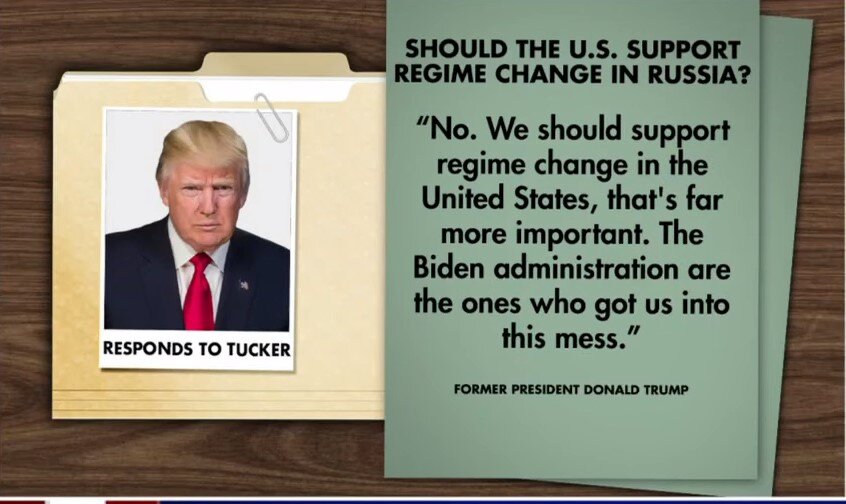 " Сложность этого мира в том, что умные люди полны сомнений, а дураки полны уверенности в себе"(с) Ч.Буковски Доня Трамп отписался на анкету телеведущего ТВ канала Fox news К. Таккера отправленную нескольким известным или ключевым политикам по поводу отношения к вмешательству Америки в конфликт между Россией и большим Хутором. Одним из вопросов был: "Должны ли США поддержать смену режима в России?" Грубо говоря: принять участие в свержении главы государства в России. Ответ Трампа:" Нет. Мы должны поддержать изменение режима в Соединенных Штатах, что более важно. Администрация Байдена это те, кто втянул нас в эту неразбериху". На самом деле Байден не только втянул в неразбериху с конфликтом между Россией и Хутором. Он так же лоббировал и активно продвигал и другую неразбериху - все эти странные толерантные игры с полами даже в собственной администрации. Компетентность приносилась в жертву толерантности. Поэтому такой результат в управлении страной. А Трамп - он н