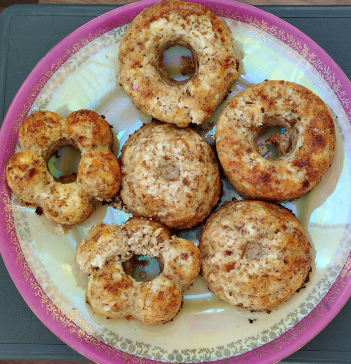 400 г творога, одно яйцо, 2 ст. ложки сметаны, стевия по вкусу, и молотые отруби и кунжутный жмых до нужной консистенции. Перемешать, дать постоять 30 минут для набухания отрубей. Разложить по формочкам, и в духовку, зазогретую до 200 градусов, на 30 минут. Готовность проверять зубочисткой. Вместо отрубей и жмыха можно, конечно же, использовать «разрешённую» муку. Но отруби злаковых безвредны для диабетиков. Любые. Основная масса углеводов, содержащихся в отрубях - это клетчатка, совершенно не усваиваемая организмом человека. А жмых разный (кунжутный, льняной, тыквенный, расторопша) продаётся у нас (Санкт-Петербург) в ларьке с орехами и специями. А ещё его можно заказать в интернет-магазине. Получилось 4 штуки «с дыркой», 2 - без дырки, такие формочки. Больше общения и рецептов - в группе "Рецепты для диабетиков" в ВКонтакте! Рецепт на странице Автор рецепта – Александра Клевиц