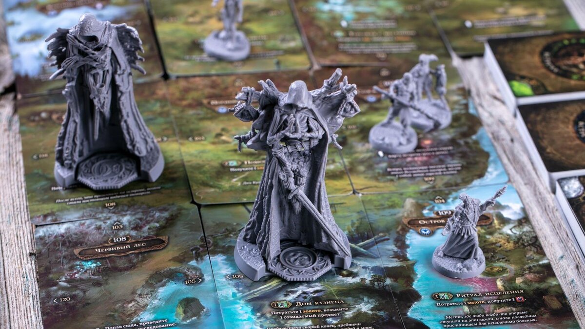 Оформлена игра тоже шикарно, причем почти каждый ее компонент. На карточках боя – красивые сцены сражений и воинов, покрытых шрамами. На картах локаций – изометрические поселения, дороги и озера, словно из старых ролевых игр вроде Fallout. Даже книга приключений содержит концепт-арты и рисунки, на которые легко отвлечься. Разочаровывают разве что огромные пластиковые фигурки менгиров: безусловно красивые, но занимающие слишком много места на локациях и закрывающие весь текст.