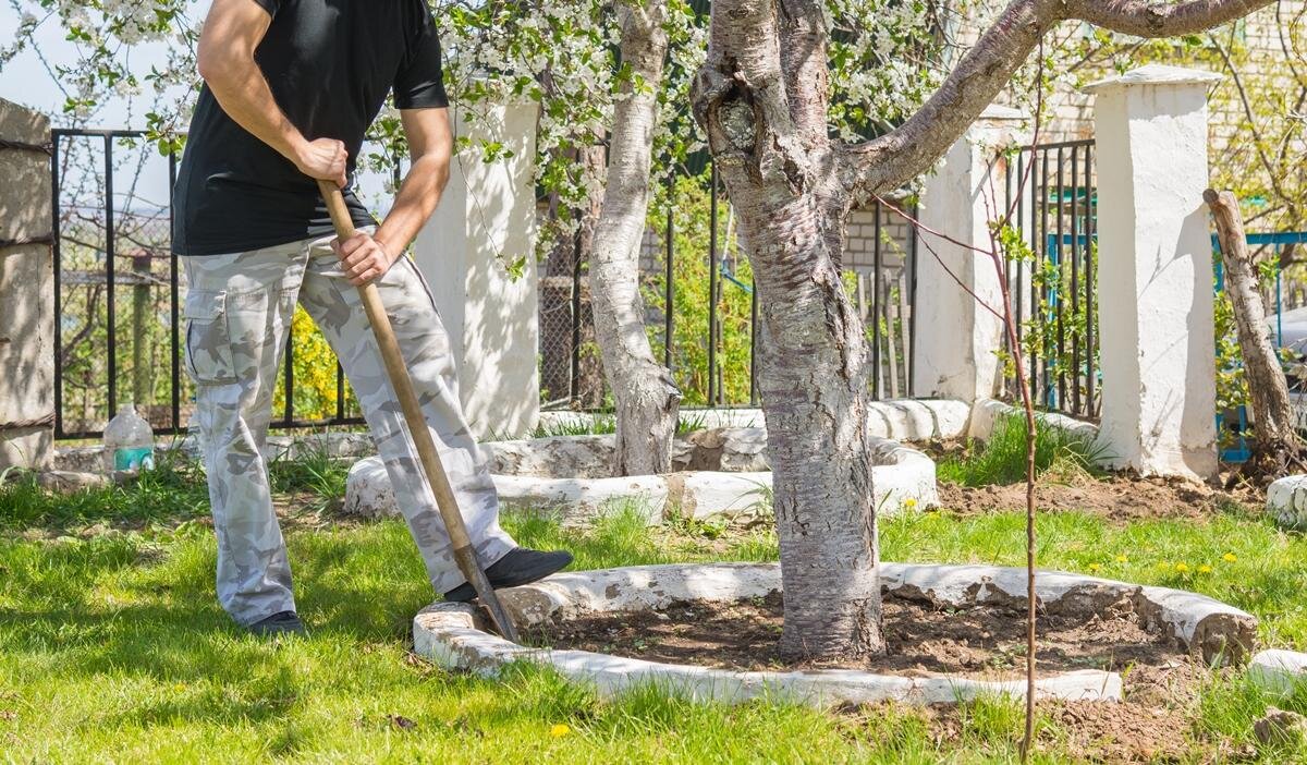 Эту часть почвы нужно содержать под черным паром, т.е. в чистом отсорняков и рыхлом состоянии. Рыхлить почву можно по мере необходимости на глубину 8--12 см.: после дождей, полива, уплотнения почвы, внесения удобрений, перед мульчированием. Осенью почву вокруг МОЛОДЫХ деревьев яблони и груши перекапывают на глубину 18-20 см на расстоянии свыше 1 м от штамба и на 10 см на расстоянии до 1 м от штамба. Вокруг деревьев вишни и сливы - на глубину 10-12 см. Для перекопки желательно использовать вилы, которые меньше повреждают корни.