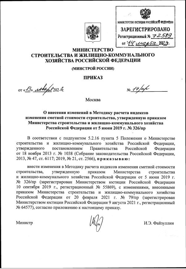Утвержден Приказ Министерства строительства и жилищно-коммунального хозяйства Российской Федерации от 13.01.2023 № 17/пр "О внесении изменений в Методику расчета индексов изменения сметной стоимости строительства, утвержденную приказом Министерства строительства и жилищно-коммунального хозяйства Российской Федерации от 5 июня 2019 г. № 326/пр". Минюст России приказ утвердил 14 марта 2023 года. Методика дополнена в п.5.4 указаниями о порядке индексации затрат на перевозку грузов железнодорожным транспортом - если нет индексов на перевозку ж/д транспортом - применяем индекс к СМР, а при его отсутствии - индекс к эксплуатации машин и механизмов.
