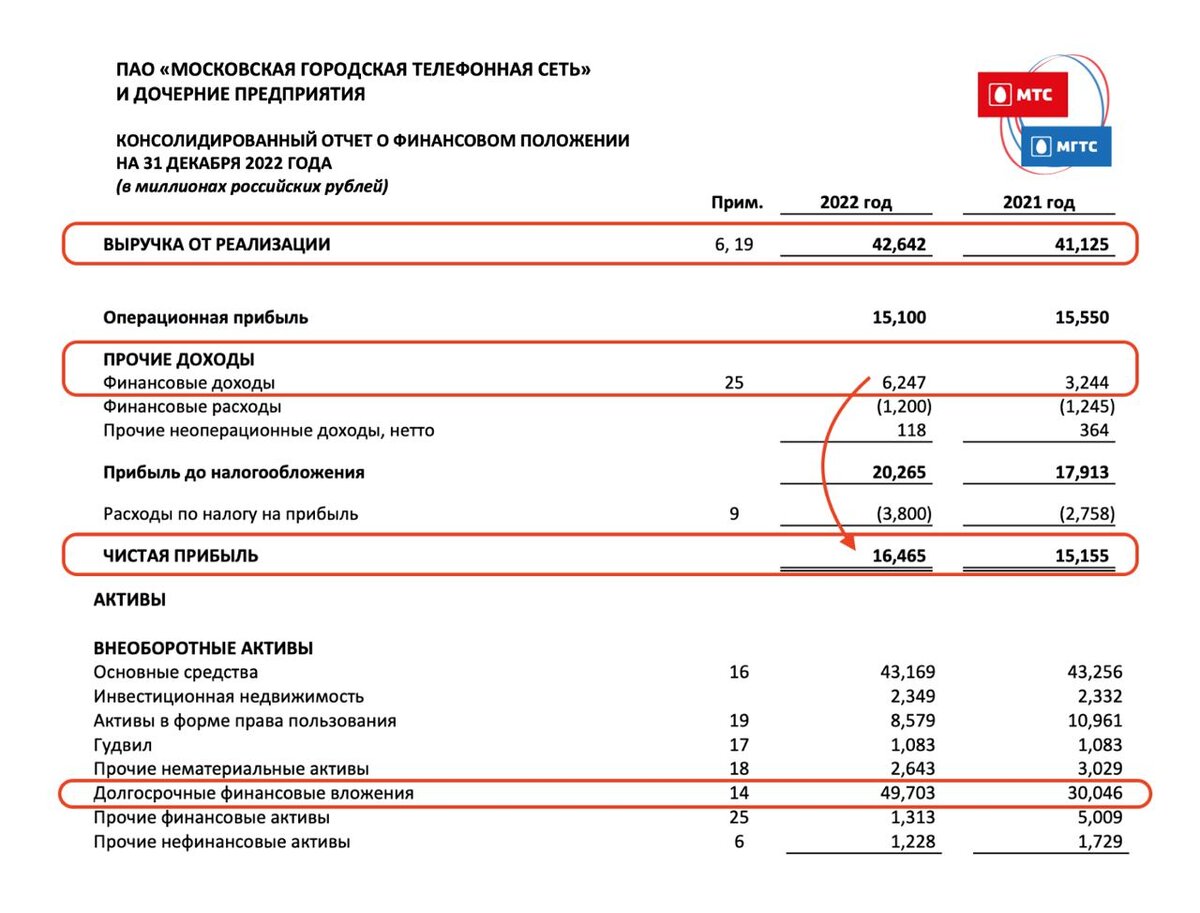 Основного акционера без буковки «Г» в названии мы уже с вами рассмотрели вчера. Теперь очередь дошла до ее дочки, которая умудрилась в феврале вырасти на 110% и потом также эпично упасть на 45%. Давайте пробежимся по отчету за 2022 год и сделаем выводы по еще одному телекому на нашем рынке. 🔺Итак, выручка компании увеличилась на 3,6% и составила 42,6 млрд рублей. Сдерживающий эффект оказало падение доходов от услуг фиксированной телефонии. Помните мы с вами в разборах Ростелекома говорили об этом стагнирующем сегменте? Так вот у МГТС он занимает долю в 26% от выручки, и доходы продолжат снижаться в будущем. 🔺Существенное влияние на чистую прибыль оказали финансовые доходы, которые выросли практически в 2 раза с 3,2 млрд рублей до 6,2 млрд. Данная статья доходов не является разовой. Она формируется из обслуживания и предоставления услуг материнской компании МТС. Это является надежным и стабильным источником дохода. В результате чистая прибыль МГТС выросла на 8,6% до 16,5 млрд рублей.