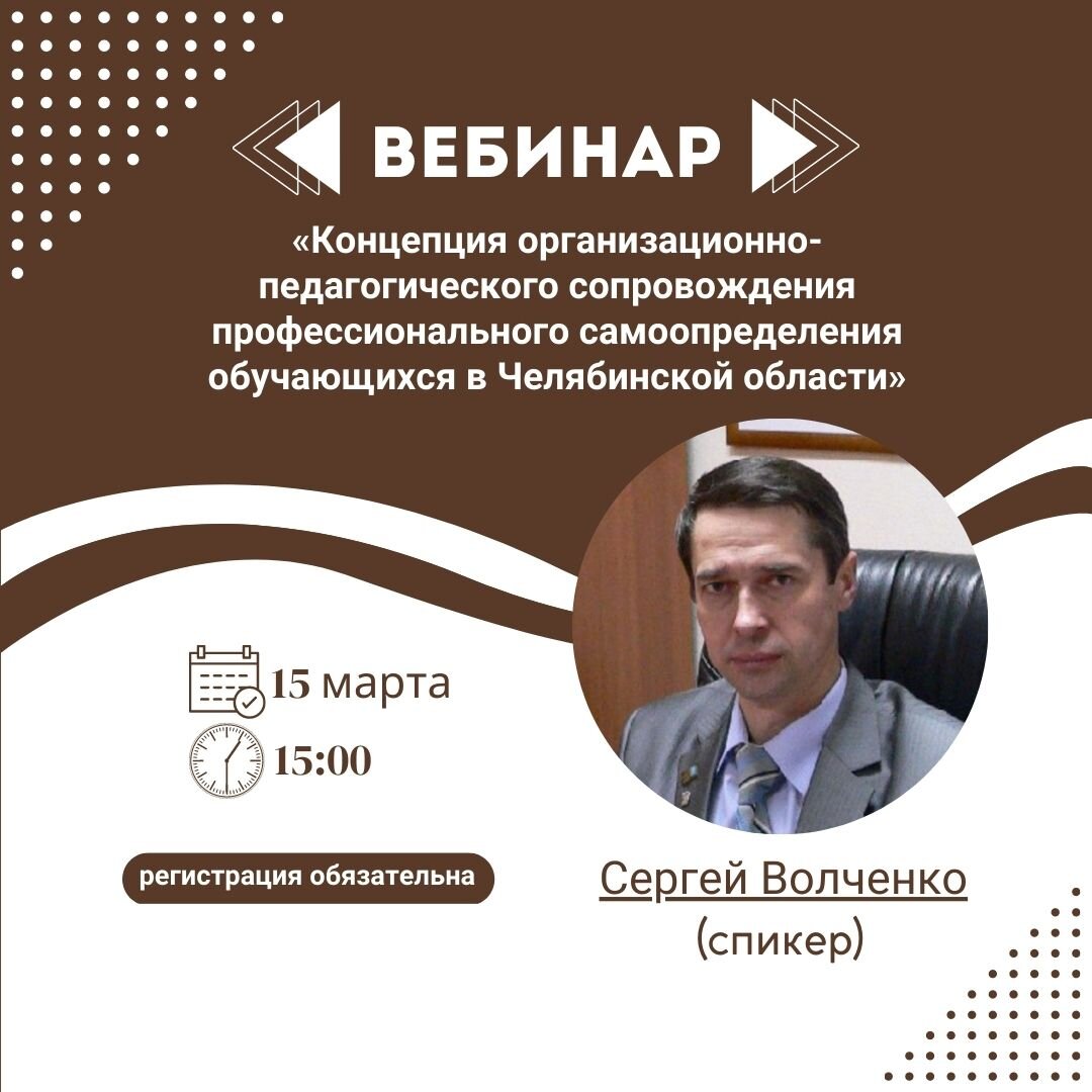 Вниманию руководителей управлений образования, директоров учреждений общего и дошкольного образования, а также всех ответственных за реализацию в муниципалитетах «Концепции организационно-педагогического сопровождения профессионального самоопределения обучающихся в Челябинской области». Сегодня, 15 марта, ровно в 15:00 (по местному времени) состоится очередное онлайн заседание комитета. В прямом эфире подведем итоги регионального этапа соревнований «Инженерные кадры России», расскажем об особенностях участия в «Большом всероссийском фестивале детского и юношеского творчества, в том числе для детей с ограниченными возможностями здоровья», обсудим организацию и проведение профильной смены «Инженерные каникулы», а также обобщим проделанную в первом квартале 2023 года работу по реализации Концепции профориентации в регионе и ответим на текущие вопросы. Спикером вебинара выступит заместитель директора по развитию Регионального центра технического творчества Сергей Волченко. Для участия в о