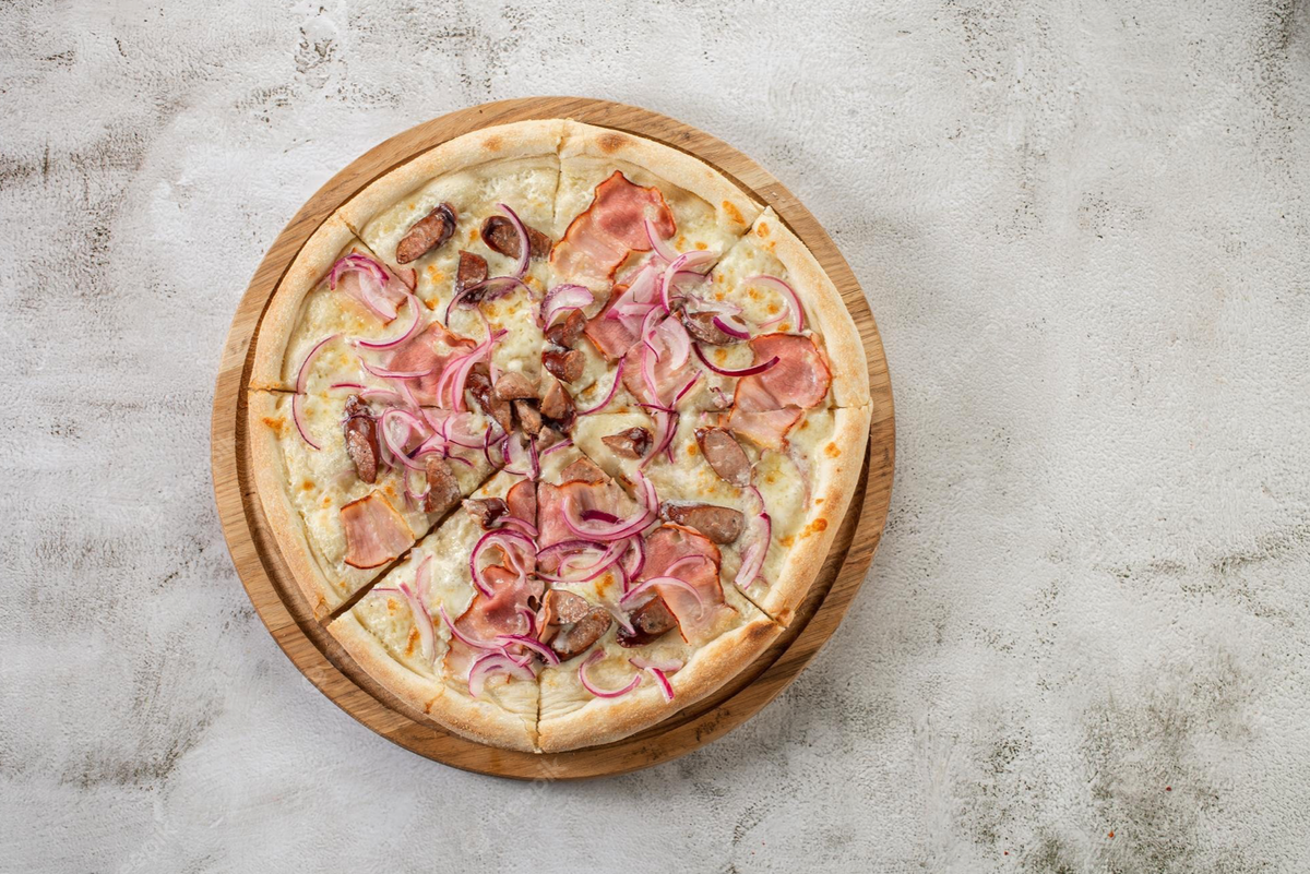 Пицца в Америке — это одно из самых любимых сытных и калорийных блюд. Традиционный корж в США должен иметь высокие бортики, чтобы поместить много сочной и жирной начинки. Самой популярным допингом являются колбаски пепперони, а затем идёт бекон и ветчина. Кроме того, американцы любят заправлять пиццу соусом «Барбекю». Если вы хотите сытно поесть, то предлагаем вам приготовить вкусную пиццу по-американски с ветчиной, красным луком и «Барбекю».