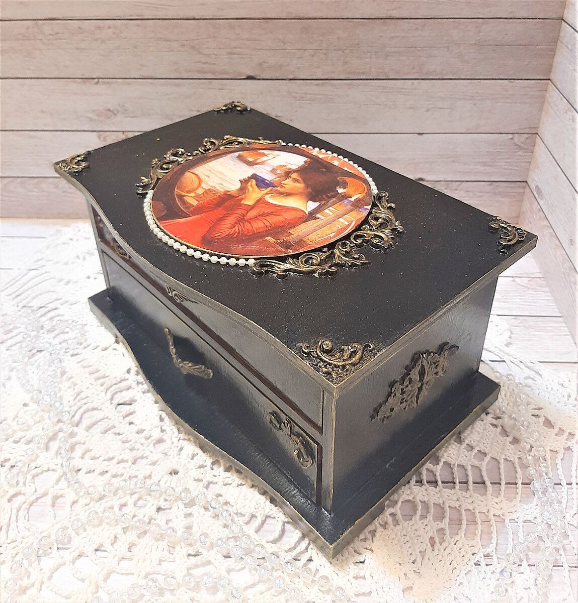Доброго дня, дорогие друзья))). Наконец-то завершила комодик, о котором так давно говорила, даже Филя его прорекламировал: Не будем толочь воду в ступе, приступим к описанию процесса. Техники привычные - декупаж и декор. Комод получился объемный - около 1 кг весом и размерами 22х14х11 см. Помимо разборной фанерной заготовки понадобилось: акриловые краски (белая, черная, золотая), морилка "Махагон", шпатлевка, отвердевающая масса, силиконовые молды, клеи ПВА и Момент, акриловый лак, декупажная карта, фанерная круглая накладка, наждачная бумага, кисти, фурнитура (ручки и шурупы), нити бусин. Смотрим))). С помощью клея ПВА собираем детали в готовый комод: Минусы сборных заготовок - огромные швы и стыки. Много времени и сил тратится на их сглаживание. Я затерла все неровности шпатлевкой и после просушки максимально отшлифовала наждачной бумагой: Крышку шкатулки украсила медальоном-накладкой, применив классический декупаж мотивом из декупажной карты: С помощью молдов и массы делаем объемный