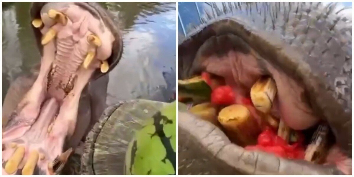 Для начала посмотрим ролик с бегемотом. На нём смотритель зоопарка угощает своего подопечного арбузом. Бегемот с лёгкостью лопает арбуз и съедает его полностью. Ни для кого не секрет, что бегемоты обладают чудовищной силой.