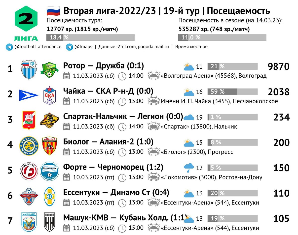 Наибольшая аудитория посетила матч в Волгограде, где «Ротор» проиграл «Дружбе» при 9870 зрителях. Этот матч занял третье место в рейтинге посещаемости на прошлой неделе среди всех лиг, больше зрителей пришло только на два матча РПЛ в Санкт-Петербурге и Краснодаре.