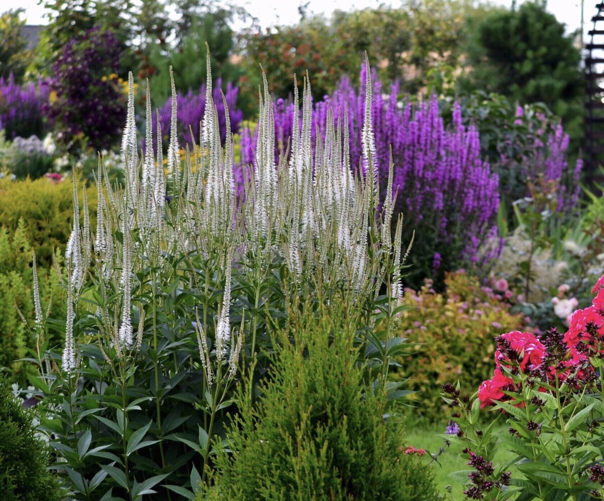 Самые параллельные из моих параллельных - Вероникаструмы!! Нравятся очень!! Выразительные. Стройные. Структурные. Высокие. Неприхотливые. Толератные. Универсальные. Засухоустойчивые. Чемпионы по декоративности, с безумно красивыми, «тропическими» листьями, которые, кстати, сохраняют идеальный вид до морозов.. Ничего и никого не боятся.. Да-даа, у вероникаструмов нет недостатков. Дружу с ними лет 10.. но так и не выяснила, родственники они вероникам или так... случайные однофамильцы.. Уверена в одном, Верониструмы НЕ ловят мучнистую… от слова совсем. Короче.. Надо брать!! У меня их два. Белый. Где взяла, не спрашивайте.. у меня пол огoроду оттуда.. от баушек)) Ростом не выше метра.. поразительно стойкий!! Своими многочисленными тончайшими пиками способен внести правильный «визуальный конфликт» в любой самый скучный цветник. Колосья долго отцветают и симпатично «стареют».. Из-за расцветки, считаю его идеальным партнером для кого угодно.. в общем... он мой кумир!! Общий в