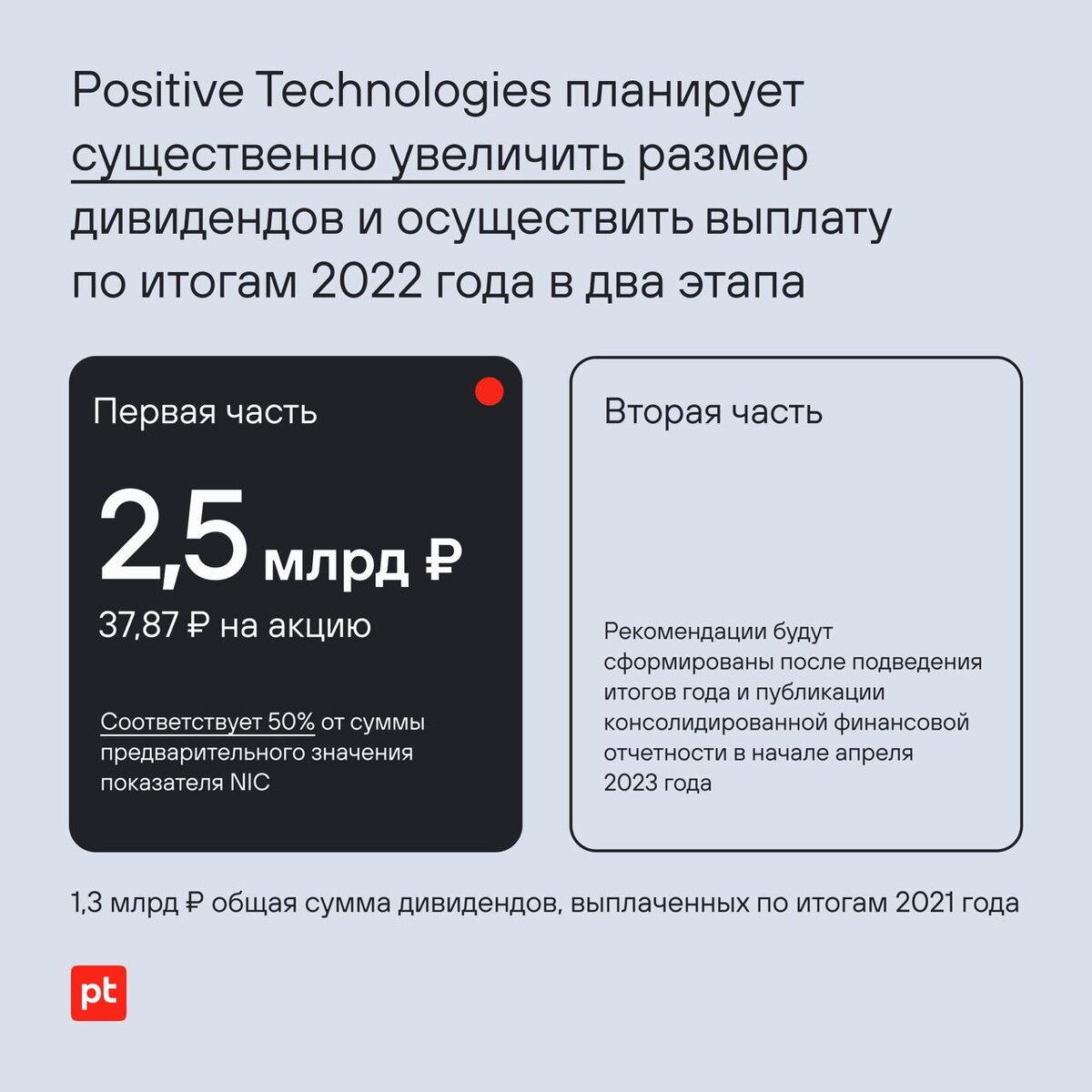 📈 В 2022 году бизнес Positive Technologies показал впечатляющую динамику. В этой связи, руководствуясь своей дивидендной политикой, мы планируем существенно увеличить размер дивидендов и осуществить выплату по итогам прошлого года в два этапа.