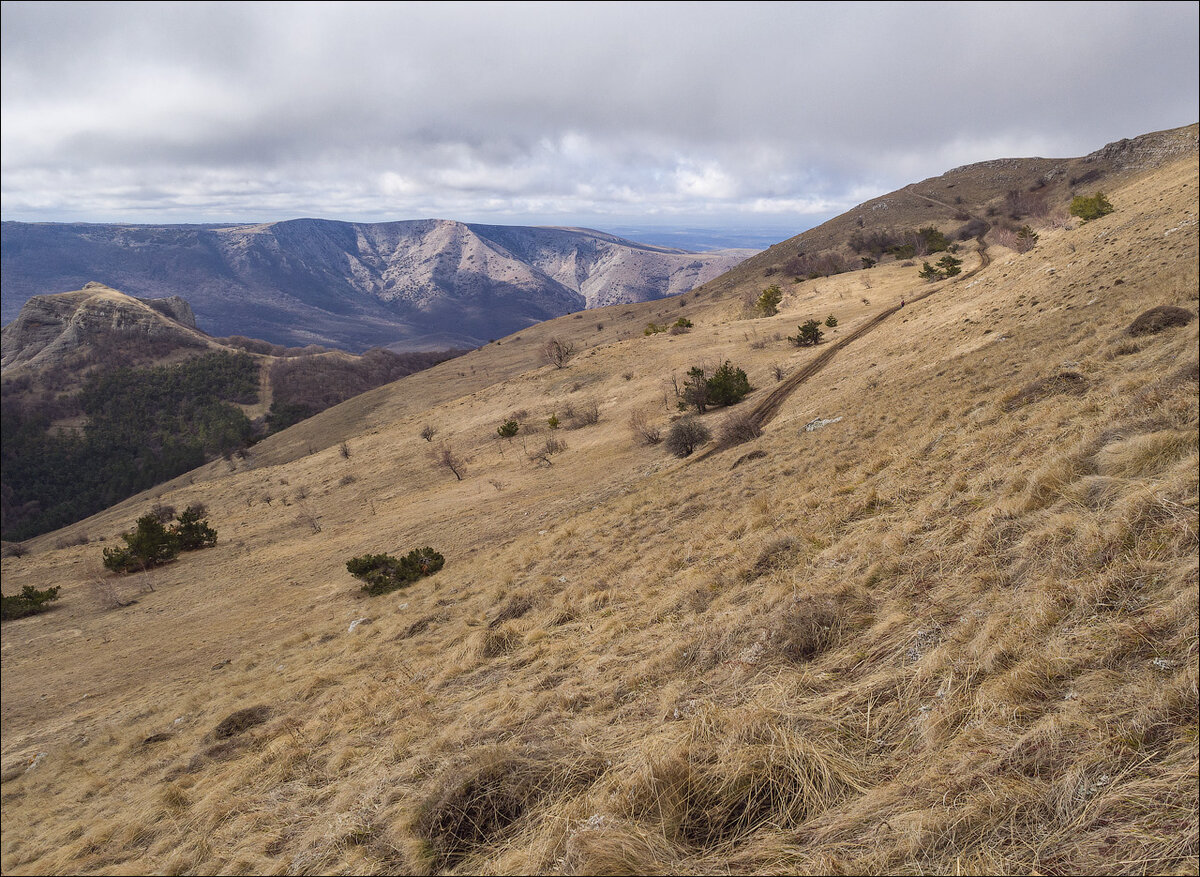 Увлёкшись фотографированим подснежников среди живописных булыжников под стеной Кудрявой Марьи (Эльх-Кая), мы слишком поздно пришли на вершину Козырька к развилке троп на Северную Демерджи. Но всё равно решили подняться на яйлу ненадолго, раз уж почти пришли. Нам пришла фантазия разделиться. Лена — дабы как можно быстрее достигнуть яйлы — пожелала штурмовать склон в лоб. Андрей же отправился по грунтовке, чтобы вместе с ней неторопливо взобраться наверх, наблюдая при этом новые ракурсы знакомых пейзажей.