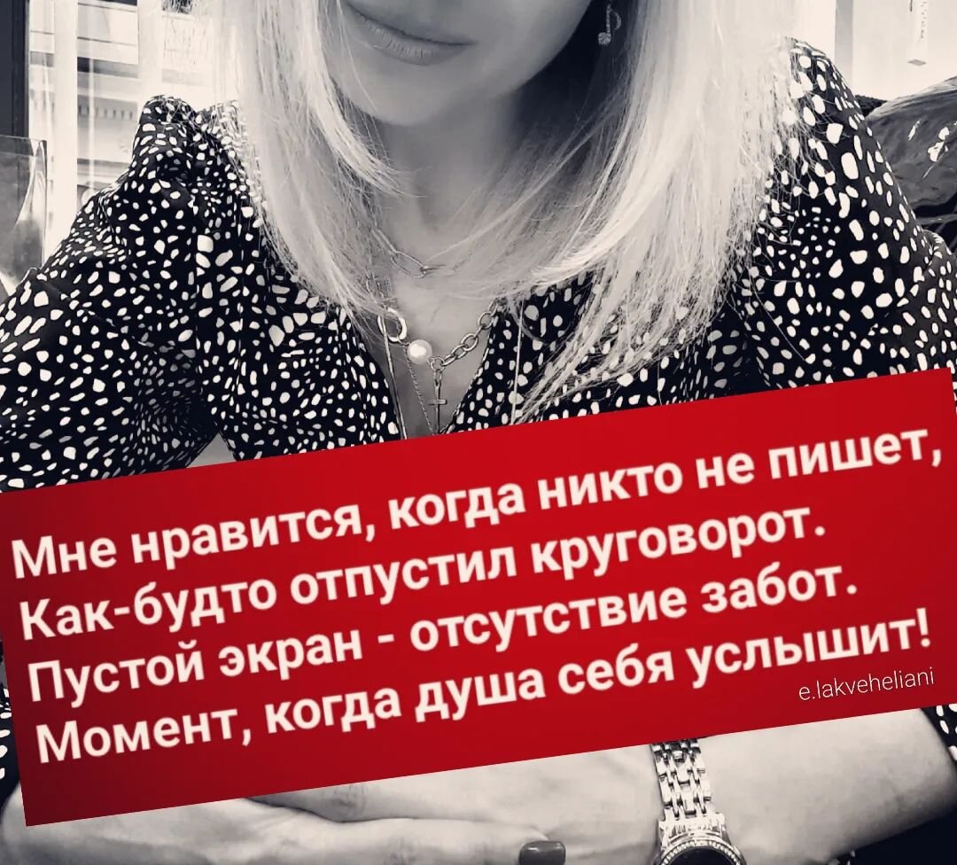 Выключаешь телефон и возникает чувство выпадения из информационного пространства. Мне это чувство нравится. В этот момент никому ничего не должен, нет срочности, нет меня для окружающих. Короткая свобода современного мира. Моя страничка на Литрес. Читайте мои книги Моя группа ВКонтакте. Заходите, читайте Больше моих стихов по ссылке https://stihi.ru/avtor/stkatrina © Copyright: Екатерина Лаквехелиани, 2023 Свидетельство о публикации №123021505908