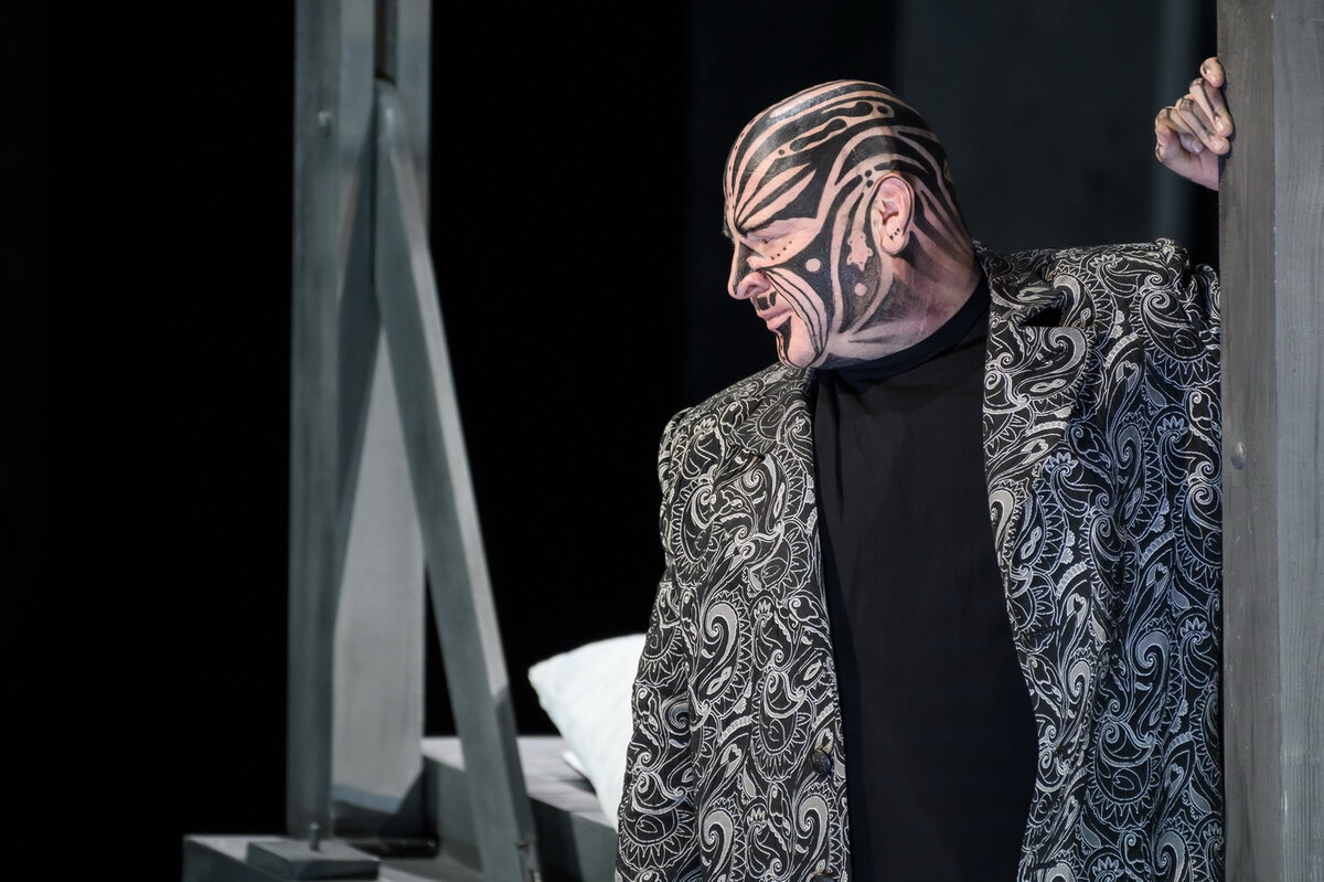 На недавней пресс-конференции, посвященной гастролям Александринского театра в Москве, которые как раз и откроются показом «Отелло» на основной сцене МХТ им. Чехова 1 апреля, Рощин сетовал на то, что спектакль задумывался в другой исторической реальности — то есть до 24 февраля 2022 года — и потому лишен острой актуальности, той, что «утром в газете — вечером в куплете». Но, ей-богу, актуальности в спектакле достаточно. А с учетом времени, когда этот «Отелло» затевался, есть даже много пророческого с изрядной долей горькой иронии, которую режиссер перепоручает колоссальным артистам: Ивану Волкову (Яго), в данном случае выступающему еще и в роли композитора, и Елене Немзер в роли совершенно шекспировского по сути, хотя и отсутствующего конкретно в этой шекспировской трагедии персонажа — шута.