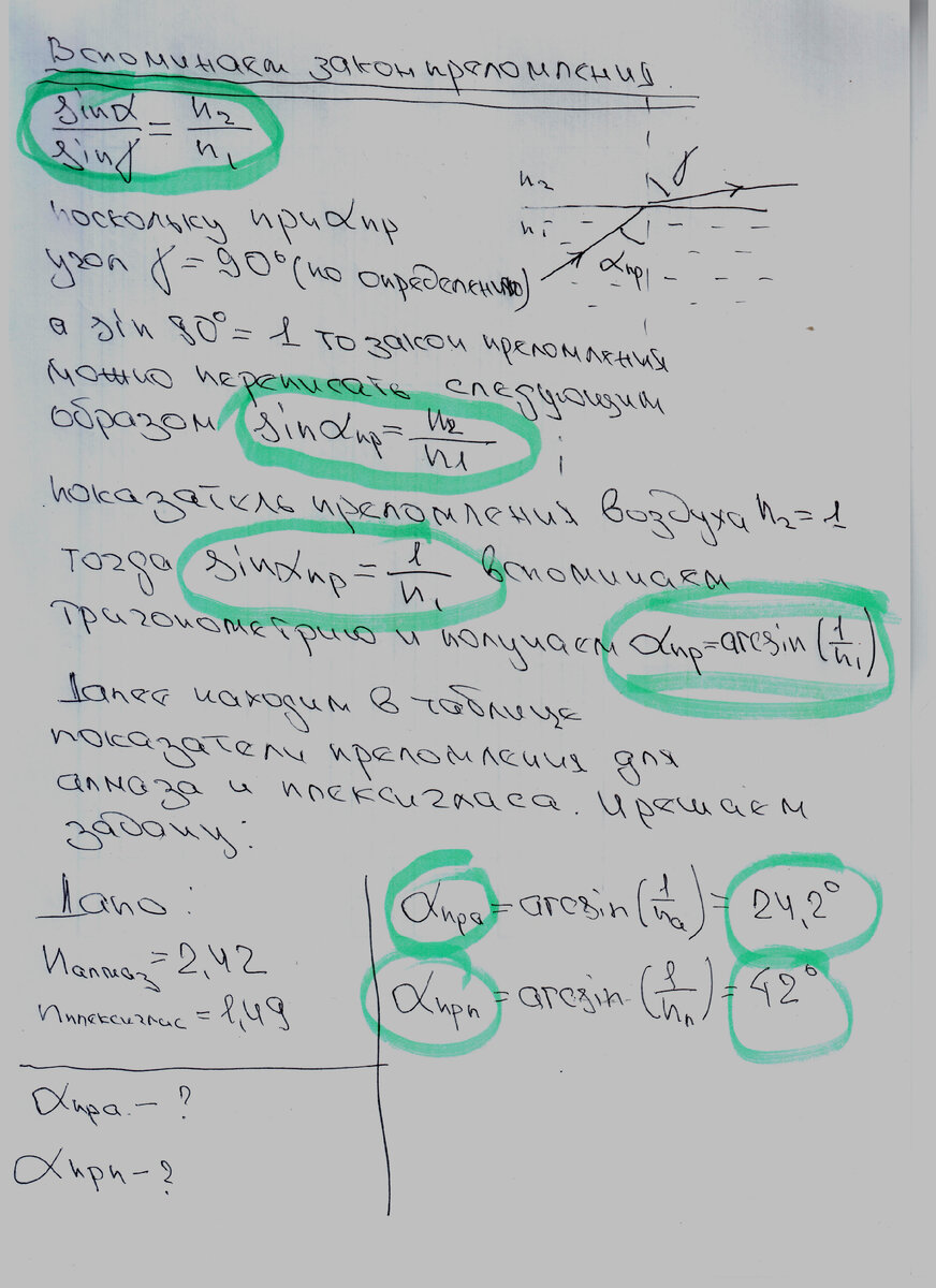 Задача: Вычислить предельный угол полного отражения для плексигласа и алмаза. Решение: Задачка в принципе очень простая, решается одной формулой. Но всё же нужно вспомнить немного теории. Для начала вспомним, что угол падения при переходе из более плотной среды в менее плотную, всегда меньше угла преломления. Соответственно при каком то максимальном значении угла падения, угол преломления достигнет максимального значения в 90* и начнёт распространяться вдоль границы двух сред. Мы подошли к определению , углом полного отражения называется угол падения при котором свет начинает полностью отражаться в первую среду. Заработайте мега-плюс в карму: Если материал был Вам полезен, поставьте пожалуйста лайк и подпишитесь. Это поможет тем кто идёт за Вами находить нужный материал и мотивирует меня на дальнейшую работу. Спасибо! Задача решена.