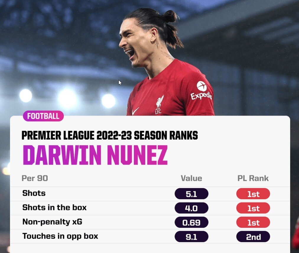 Это, без сомнения, одна из причин, по которой Дарвин произвел такое сильное впечатление в этом сезоне . Он находится в 99-м процентиле по вкладу в атаку (сочетание нештрафных бросков с созданными моментами в открытой игре) в Премьер-лиге.