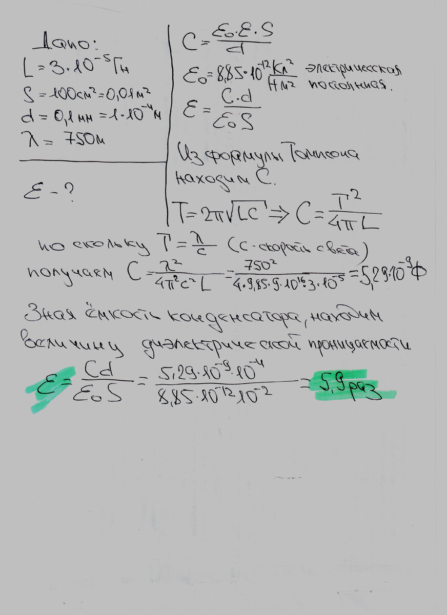 Задача: Катушка индуктивности 0,3 мкГн присоединена к плоскому конденсатору с площадью пластин 100 см.кв. и расстоянием между ними 0,1мм. Чему равна диэлектрическая проницаемость среды, заполняющей пространство, если контур резонирует на волну длиной 750 м? Решение: Казалось бы, у нас есть набор несвязанных между собой параметров. Геометрические размеры конденсатора, длина волны на которую резонирует контур, а найти надо вообще диэлектрическую проницаемость. Чем хороша физика, она учит находить причинно следственные связи, даже там где казалось бы они отсутствуют. Что особенно важно в технических профессиях. Во первых вспоминаем от чего зависит электрическая ёмкость плоского конденсатор. Она прямо пропорциональна произведению электрической постоянной на диэлектрическую проницаемость среды(то что нам нужно найти) на площадь пластин конденсатора и обратно пропорциональна расстоянию между пластинами d. Ну вот, в этой формуле у нас есть диэлектрическая проницаемость, искомый пара