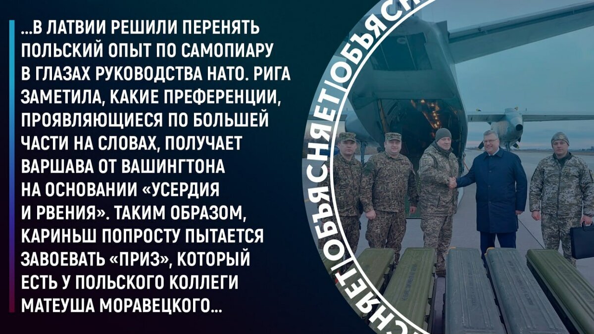Польская школа саморекламы. Премьер-министр Латвии Кришьянис Кариньш заявил, что прибалтийская республика передавала вооружение Украине. Это происходило еще до начала специальной военной операции. «Мы начали предоставлять военную помощь Украине перед началом СВО в феврале 2022 года. Зенитные ракеты Stinger из Латвии были среди вооружения, которые украинцы использовали в первые дни сражений», – заявил Кариньш. Вспомним, как выглядела эта помощь. Благо Интернет хранит все, и существует фотография, датируемая 22-23 февраля 2022 года, где запечатлены представители министерства обороны Латвии и украинские военные на одном из аэродромов неподалеку от Киева, а также момент передачи ВСУ аж целых шести ПЗРК в транспортных контейнерах. Похоже, в Латвии решили перенять польский опыт по самопиару в глазах руководства НАТО. Рига заметила, какие преференции, проявляющиеся по большей части на словах, получает Варшава от Вашингтона на основании «усердия и рвения». Таким образом, Кариньш попросту пы