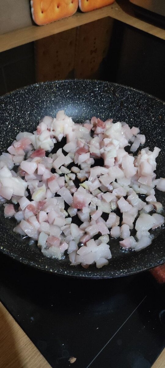 Классическая белорусская картофельная бабка с салом - это традиционное блюдо белорусской кухни, которое не разорит Вас и накормит всю семью. Дешево, просто,сытно - все, как мы любим. Ее можно запекать в печи или в духовке, в отдельных горшочках или на противне. Единственный секрет - сало надо брать с мясными прожилками. Сало без прожилок растопится, и не оставит в блюде практически никаких следов, кроме сытости. Ингридиенты просты - картофель, сало, сливочное масло, репчатый лук. Подавать со сметаной или с молоком. Я бы не советовала добавлять какие-либо специи, кроме соли и перца - это может "забить" классический вкус бабки без излишеств. Для начала надо на сковородке обжарить и растопить сало, нарезанное кубиками. У меня как раз не самый лучший вариант сала, мало мясных прожилок. Масло добавлять не надо, только если сала совсем мало, а мясо много - тогда можно добавить. В сало добавляем нарещанный репчатый лук. Жарить 7-10 минут. Далее чистим картофель. На один противень у меня ушла