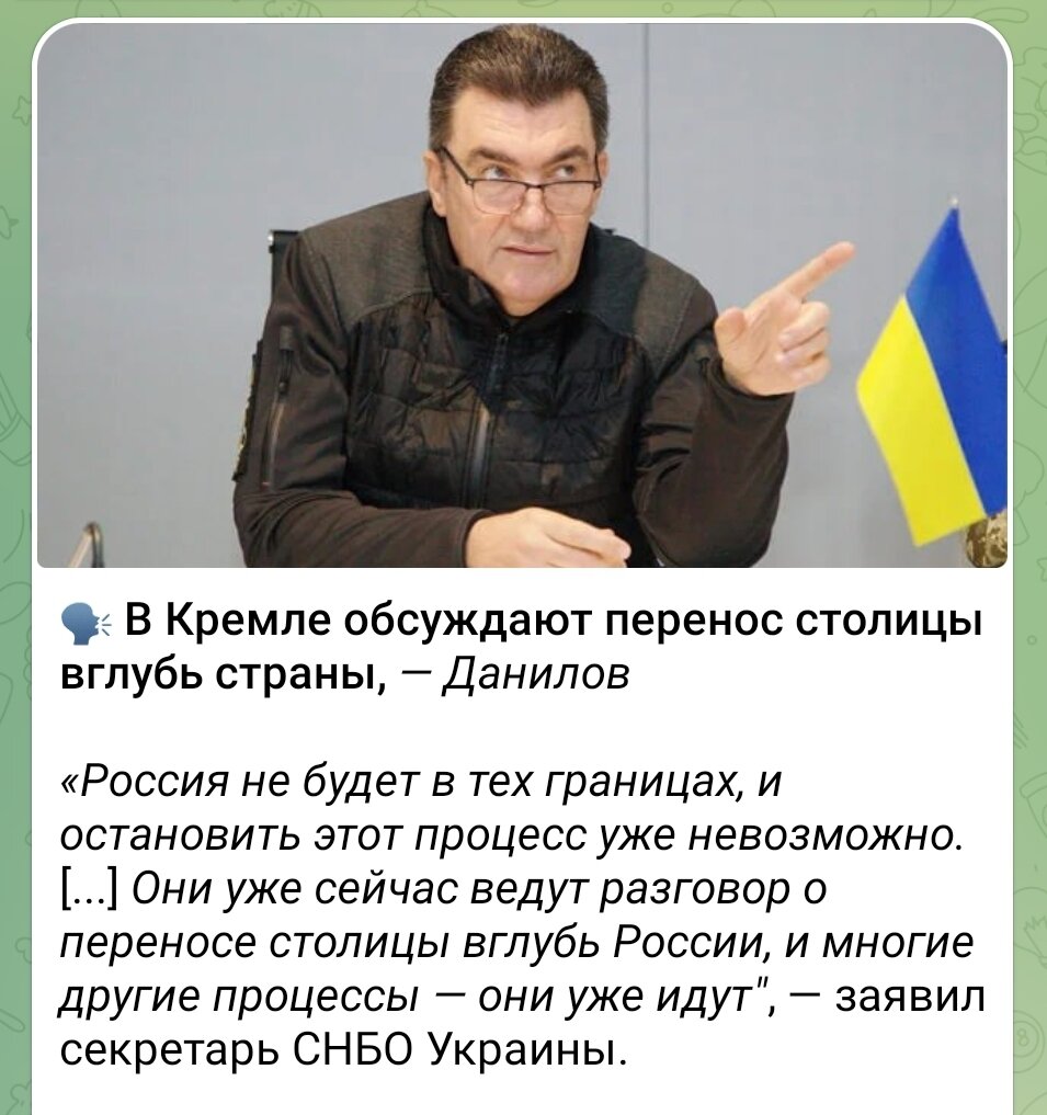 Казалось бы, как здравый человек может поверить словам Данилова о переносе столицы России вглубь страны? Я не знаю насколько здрава я, но каждый раз читая фантазии этого человека, пытаюсь понять кому он всё это рассказывает? Кто его аудитория? Русскоязычный секретарь СНБO из Лугaнска ужа давно отличился своей непримиримой борьбой со всем русским. Это как пчёлы против мёда. А вообще в политике оно как бывает: финансово выгодно быть в вышиванке - наденут, а коль ветер сменит направление, так можно и косовороткой не побрезговать. "Осведомлённость" Данилова и его колоссальная уверенность в собственных "предсказаниях" меня умиляют. Это такая игра на публику или он реально сам себе верит? Если второе, то я ему завидую. Уверенности в завтрашнем дне мне как раз очень не хватает. Фантазёров, доселе невиданных, появилась тьма. Соревнуются между собой в русoфо бии. Так понимаю, свои овации они всегда находят, не зря же стараются. Вот заявил Данилов о том, что "Россия не будет в тех границах,