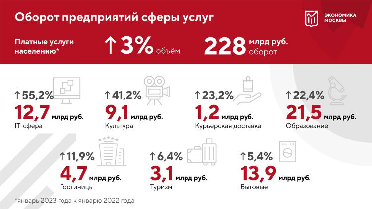 Мэр Москвы Сергей Собянин сообщил о росте оборота столичных предприятий в разных сегментах сферы услуг. Об этом он написал в своем Telegram-канале. «На 3% увеличился оборот столичных предприятий сферы услуг. Наибольший рост — в электронных услугах и сервисах в области ИТ. За январь 2023 года заработано 12,7 млрд рублей, что на 55,2% выше, чем в январе 2022-го. Такие высокие показатели связаны с ростом спроса в сегменте онлайн-кинотеатров», — написал Сергей Собянин. Он также добавил, что на втором месте по приросту оборотов стоят учреждения культуры. Их выручка увеличилась за год до 9,1 млрд рублей (это 41,2%). На третьем месте — организаторы курьерской доставки. Их обороты выросли до 1,2 млрд рублей (23,2%). Кроме того, развитие внутреннего туризма привело к увеличению выручки гостиниц до 4,7 млрд рублей (11,9%). В целом, общий объём платных услуг, оказанных московскими предприятиями, в январе 2023 года достиг 228 млрд рублей.