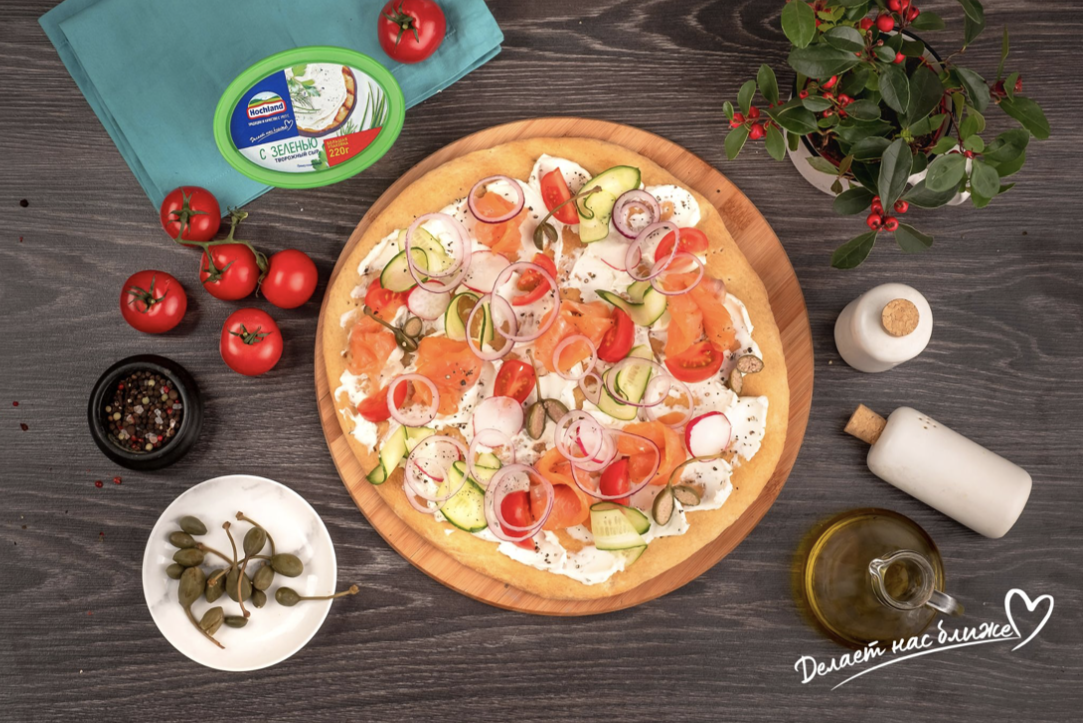Давайте сделаем домашнюю лепешку – аналог пиццы, только вкуснее и с большим количеством ингредиентов! Это возможно с новым рецептом с творожным сыром Hochland. В сыре сочетаются аромат зелени и польза натурального творога. Дополняют творожный сыр кусочки лосося, овощи и пышное тесто. Ингредиенты: Готовим! 1. Залейте дрожжи тремя столовыми ложками теплой воды. Перемешайте и оставьте на 15 минут, чтобы дрожжи поднялись. 2. В большую миску просейте муку с солью. Сделайте в муке «колодец», вылейте в него дрожжи и оставшуюся воду и замесите тесто. Когда почти вся мука будет вмешана, добавьте в тесто 1 столовую ложку оливкового масла и продолжайте месить тесто до тех пор, пока оно не станет гладким и эластичным – примерно 10 минут. 3. Скатайте тесто в шар, смажьте оливковым маслом и положите в миску. Затяните миску пленкой и оставьте на 1 час в теплом месте, пока тесто не поднимется в раза. Обомните тесто и слегка вымесите. 4. Разогрейте духовку до 220 ˚С. Раскатайте тесто в круг, смажьте о
