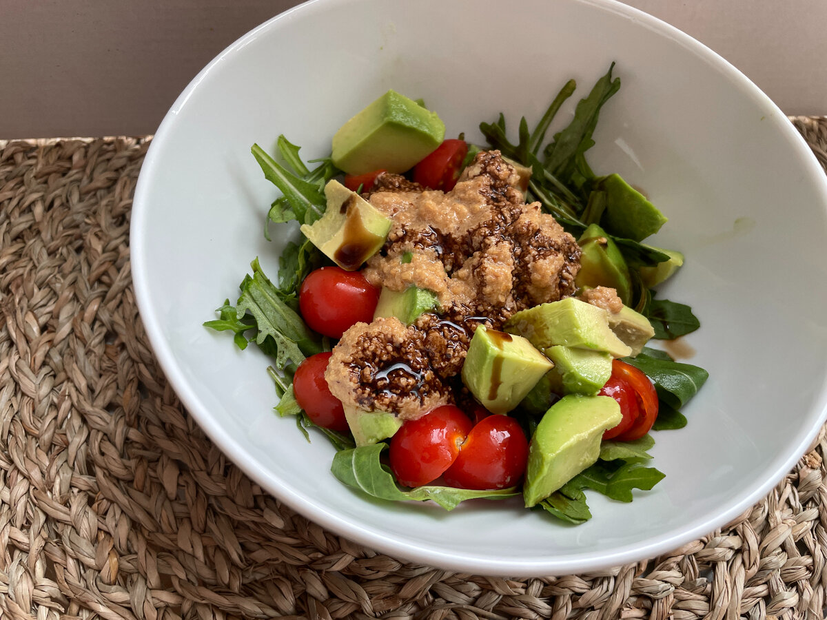 Этот салат прекрасен как самостоятельное блюдо и как основа для создания новых вариаций. Например можно добавить жареную курочку или креветки. Всё приготовление от ингредиентов до сборки собрала в видео: Пропишу ниже текстом Ингредиенты Собираем в глубокую миску по-порядку: Приятного аппетита!