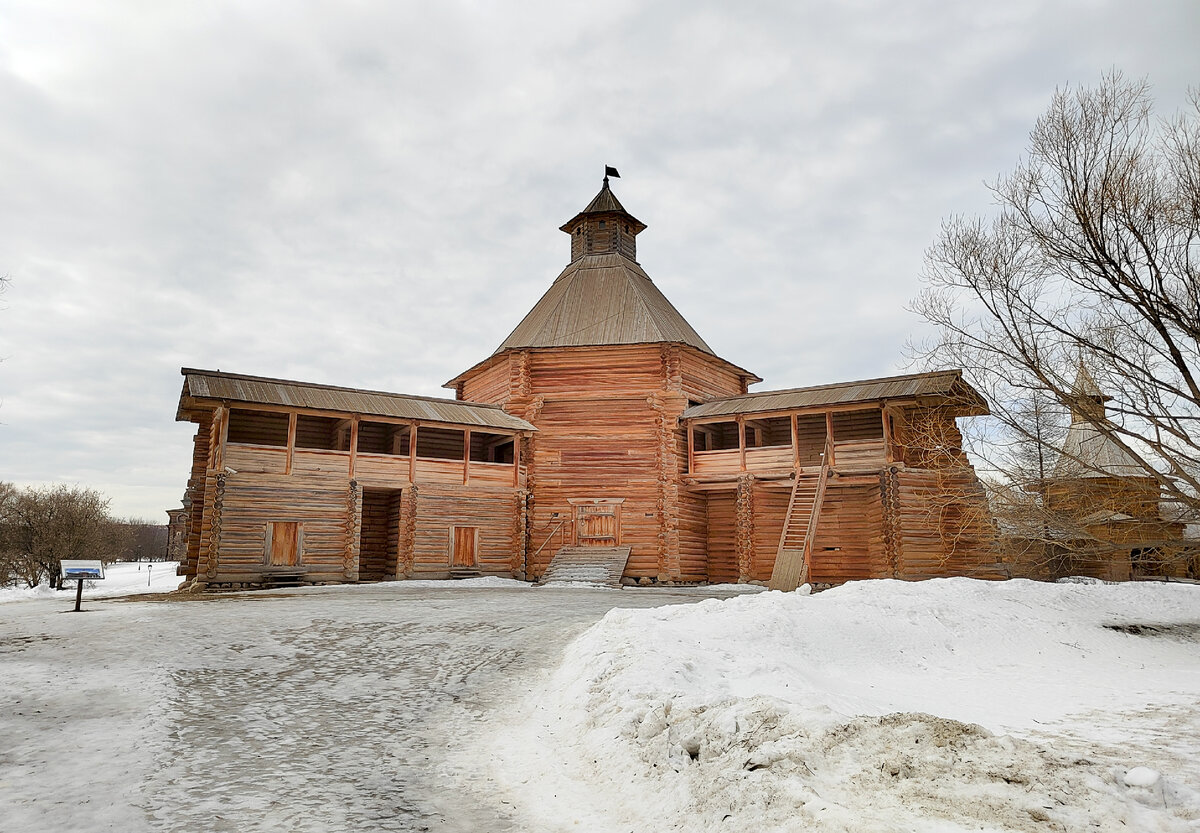 Небольшая прогулка по Коломенскому 15 марта 2023 года, чтобы увидеть замечательные деревянные сооружения. Просматривая карту Москвы в поисках потенциально интересного места для небольшой прогулки, я наткнулся на "Русское деревянное зодчество" в Коломенском, совсем недалеко от недавно открывшейся станции метро "Кленовый бульвар" (в составе Большой кольцевой линии). В Коломенском я был один раз, в 2014 году, а теперь решил прогуляться в относительно новом для меня месте. Поскольку наступила весна, снег активно тает, и повсеместно были лужи, лед, мокрый снег, так что моя обувь частично промокла. Прогулку, тем не менее, считаю успешной. Внимание! В некоторых из деревянных сооружений доступны выставки в теплое время года. Моховая башня Сумского острога. Эта башня относится к 1680-м годам. Острог был основан при впадении реки Сумы в Белое море для защиты русских поселенцев. На подлинных бревнах башни сохранились следы шведской картечи времен Северной войны начала XVIII века. Сооружение перев