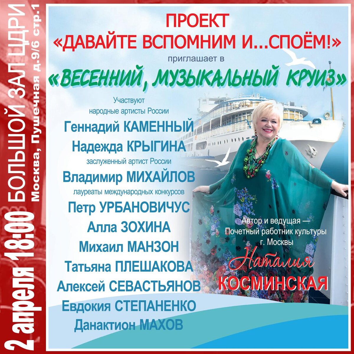 Музыкальный проект «Давайте вспомним и… споем!..» В этот весенний вечер в любимом всеми москвичами и гостями столицы Большом зале ЦДРИ предлагаем отправиться в настоящий «Музыкальный Круиз» по волнам хорошего настроения! Совсем скоро долгожданное лето, которое подарит нам новые путешествия, знакомства, много шуток, смеха и, конечно, любимые песни. В преддверии этих событий зрители встретятся с лучшими артистами столицы. Участники нашего концерта: народный артист России Геннадий КАМЕННЫЙ — ученик Г. Виноградова, непревзойденный исполнитель ретро-песен народная артистка России Надежда КРЫГИНА — солистка оркестра «Россия» заслуженный артист России Владимир МИХАЙЛОВ — композитор, экс-солист ВИА «Акварели», «Лейся, песня» лауреаты международных конкурсов Петр УРБАНОВИЧУС — музыкант, певец, финалист проекта ЦТ «Голос 60+» Алла ЗОХИНА — композитор, пианистка, сценарист, поэт. Автор спектакля театра им. Е. Вахтангова «Люся» о легендарной Людмиле ГУРЧЕНКО Михаил МАНЗОН — экс-солист оркестра им.