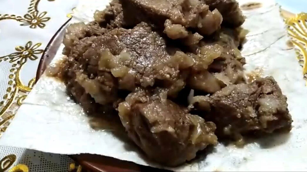 Мясо, приготовленное по такому рецепту получается нежное и мягкое. При тушении жесткого мяса нужно увеличить время готовки. Процесс займет больше времени, но оно того стоит. Рецепт: Мясо нарезать большими кусочками и выложить в сковороду Лук порезать и положить на мясо. Залить водой. Сливочное масло нарезать кусочками и выложить сверху. Тушить 60 минут. Добавить соль по вкусу, чеснок, перец, лавровый лист и тушить еще 15 минут. Добавить уксус и тушим до готовности мяса. В качестве гарнира отлично подойдет рис, гречка, картофель.