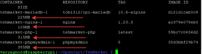 Контейнеры Docker основаны на разных дистрибутивах Linux. Дистрибутивы же эти кроме нужного нам ПО содержат много других программ для других задач, а потому образы иногда получаются неоправданно большими. Чтобы найти маленькие образы надо искать образы основанные на Alpine Linux они часто содержат в своем названии -alpine. Этот дистрибутив содержит минимально количество предустановленных в него программ, а его изначальный размер равен 4 Мб. Большинство официальных Docker образов содержат версию основанную на этом дистрибутиве. Если мы собираем образ сами, то мы тоже можем использовать в качестве базового образа образа alpine linux. Еще есть варианты с использованием slim образов из которых также удалено ненужное ПО. Существуют даже -alpine-slim они еще меньше, но их надо тщательнее тестировать на надежность работы. Вот сколько места занимают образы моего стека: Кроме этого раз уж мы изменили архитектуру работы нашего контейнера с phpMyAdmin и раз все у нас теперь обрабатывает Nginx, т