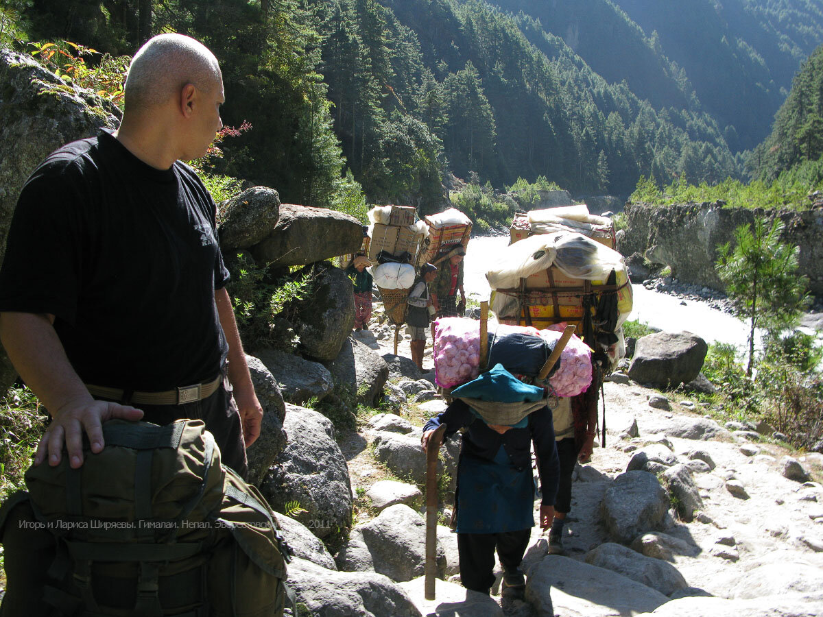 Рассказы о том, что шерпы с легкостью переносят грузы – неправда. Шерпы несут груз из последних сил, тяжело дыша и часто отдыхая. Напряжение заметно по их искаженным лицам. Иногда на очень крутых подъемах носильщики сдержанно вскрикивают от напряжения. Иногда падают без сил и не могут встать.