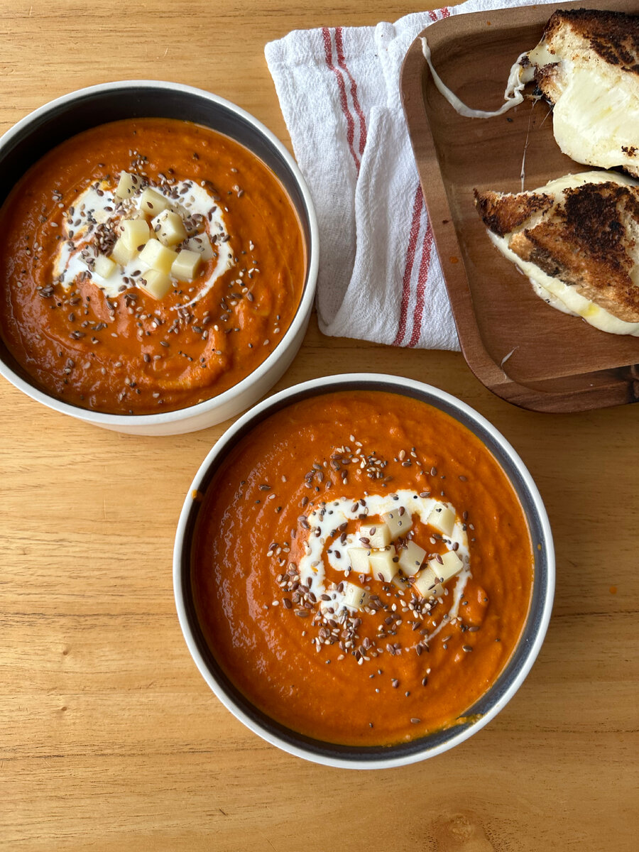 Привет! Сегодня делимся рецептом очень простого супа-пюре, которым можно разнообразить обед или впечатлить близких. Ингредиенты: Режем овощи и сыр кубиками. Отправляем нарезанные овощи в кастрюлю и обжариваем на среднем огне в течение 10-15 минут. После добавляем очищенные томаты и разбиваем их лопаткой. Добавляем специи: соль, перец, паприку и немного орегано. Регулируем кислотность, добавляя столовую ложку сахара. Томим еще 5-7 минут и снимем с огня. Теперь взбиваем суп блендером до получения однородной массы. Вливаем немного сливок и снова взбиваем. Возвращаем суп на огонь и через пару минут добавляем нарезанный сыр. После того, как сыр расплавился, снимаем с огня и подаем суп, украсив его сливками, сыром и любыми семенами. Идеально подать вместе с сендвичем из хлеба и моцареллы. Приятного аппетита!😻 И помните, с нас рецепт, а с вас подписка! До завтра!