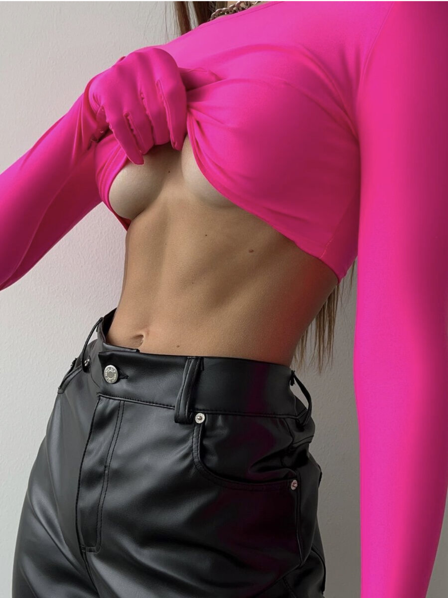 Тренд этого сезона укороченные топы с длинными рукавами (перчатки).