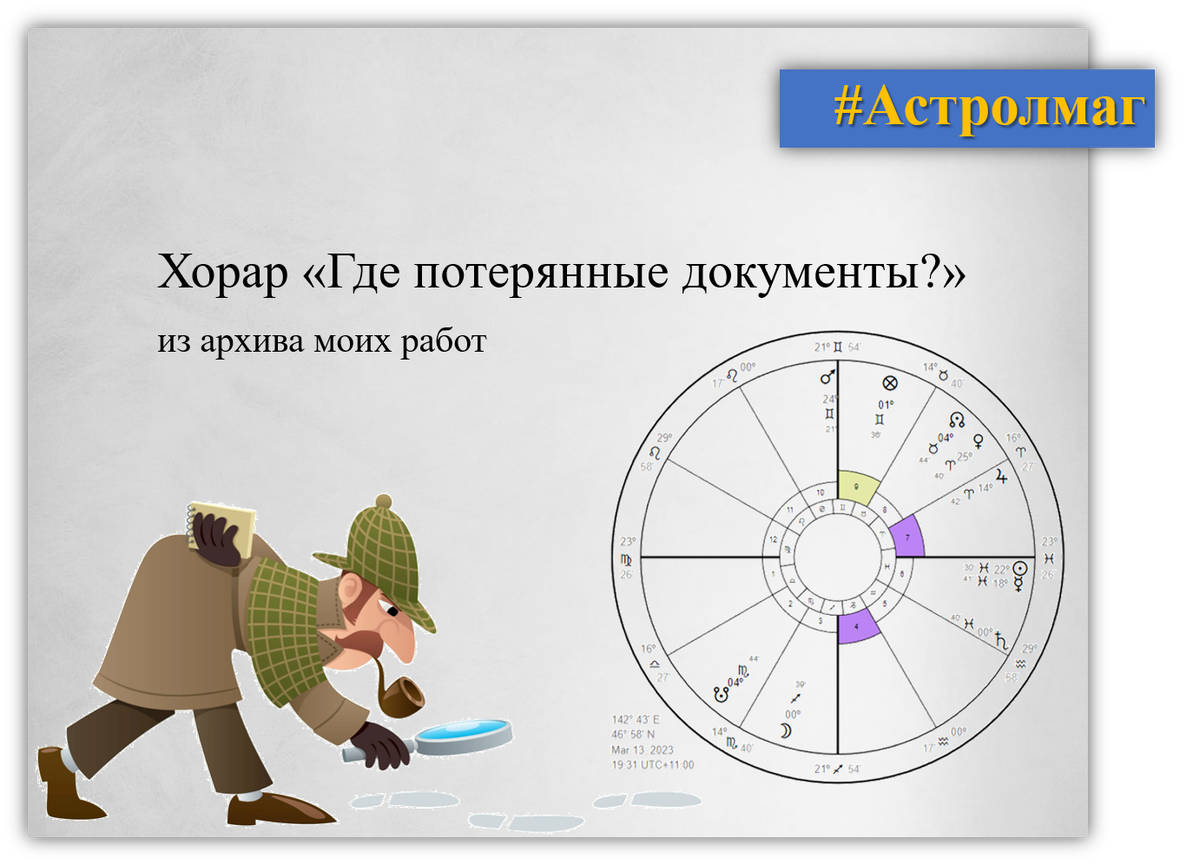 Один мой клиент обратился ко мне с вопросом, где его знакомая могла потерять документы на квартиру накануне её продажи. Со слов его знакомой, все документы хранятся в одном месте, однако она всё перебрала и не смогла найти договор купли-продажи. На восстановление документов уйдёт много времени, а сделка-купли-продажи уже назначена. Получается, что мой клиент задаёт вопрос о своей знакомой и интересуется, где она могла потерять договор купли-продажи. Хорарная карта подтверждает, что мой клиент действительно переживает о своей знакомой и хочет помочь ей найти документы как можно скорее. Проверяем хорар на радикальность: 1). Клиент думает о своей знакомой и переживает о потерянных ею документах. 2). Потерянные документы находятся в скрытом месте, где хранится мусор, в северо-западной стороне дома квартиры. 3). Документы находятся среди других вещей, связанных с ценными бумагами и деньгами. В комфортном месте. Зная, что знакомая клиента не выносила документы из дома, и что они должны нах
