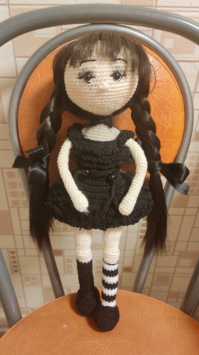 У меня тут девочка связалась. Красавица! Жаль было отдавать, но пришлось. Вязала на день рождения девочки. Ей 13 лет исполнилось. И, говорят, что это был самый лучший подарок. Вот. Теперь скучаю по девочке-красавице. Думаю, что многие в курсе как её зовут:)) Это моя первая кукла. Немного корявенько получилось. Но вязать куклу мне очень понравилось! Буду ещё пробовать. Вязала я её из пряжи "Alize Бахар",GIZA". Наполнитель холлофайбер. Тресс для кукол. Глаза пришиные. Использована проволока. Так что у куколки гнутся ручки и ножки. Даже наклон головы можно регулировать. Рост получился 37 см. Вот так выглядит платье сзади. Волосики можно расплетать. Оказывается, их можно плойкой завивать. Одежду и туфельки можно снимать. Муж настоял, чтобы я ей сшила трусики. Что за ткань, я не знаю. Предыдущее моё рукоблудие здесь: Зайки Никто не захотел себе рыбку забрать. Может стих писать не захотелось. Ну и ладно. Отдам её первому, кто напишет комментарий "Хочу рыбу". Ну и как бы всё. Всем тепла и плю
