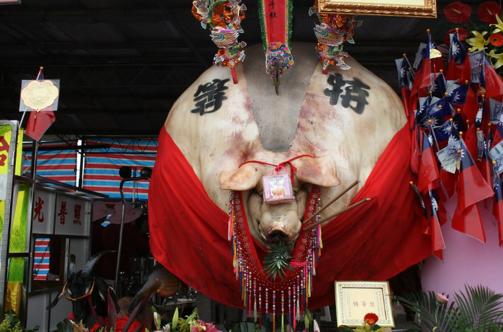 Их откармливают насильно на протяжении двух лет, делают массаж от пролежней, когда свиньи уже не могут двигаться. Идеально, чтобы свинья весила 900 килограмм. Зрелище, надо признать, шокирует даже крепкую нервную систему, не верится, что такое чудовище может существовать. Праздник Божественных Свиней в Тайване проходит в тайваньской Сенсье ежегодно. Вся его суть – проносить через город своих нереально перекормленных деформированных свиней напоказ. Сделать это может каждая обеспеченная семья, потому что два года накармливать свинью довольно дорого. Нарядных, украшенных цветами, свиней на тачанках их провозят по улицам, чтобы показать простым жителям. Зрелище не всегда радостное, так как живущая несколько лет в закрытом помещении без возможности двигаться свинья очень пугается шума и толпы. Она кричит и неконтролируемо испражняется. И несут в храмы, чаще всего посвященные очень популярному монаху Циншуй. Тогда как другие тайцы просто поклоняются ему, обычаи общины хакка требуют приносить